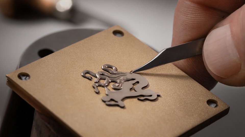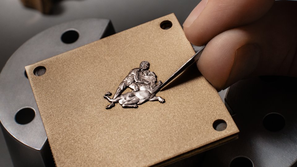 ヘラクレス像は18Kホワイトゴールドから、手作業で細やかな彫りを施して形作られています。神話の中の恐ろしい獣と命がけで戦うその姿は、強さと力を体現しています。厚みはわずか0.5mmであるにも関わらず、ヘラクレス像は豊かな立体感と躍動感を感じさせます。筋肉、顔つき、髪、そして戦いを挑む獣の毛並み、鱗、羽根に至るまで、彫金師が精巧に彫り上げた細部がこの迫力を生み出しています。ヘラクレス像の製作には、1体につきおよそ40時間が費やされました。