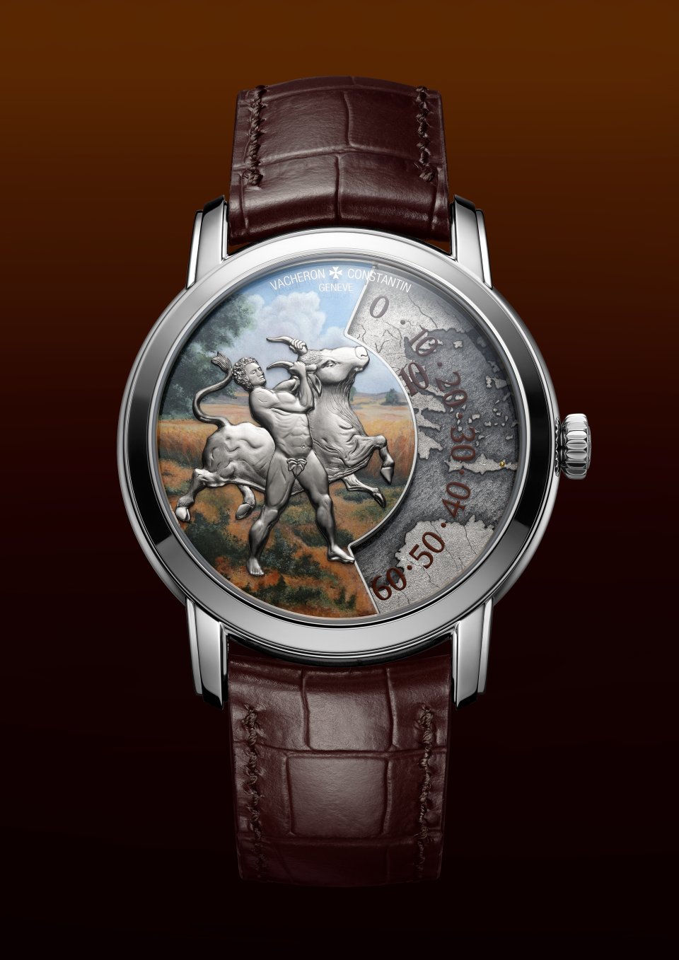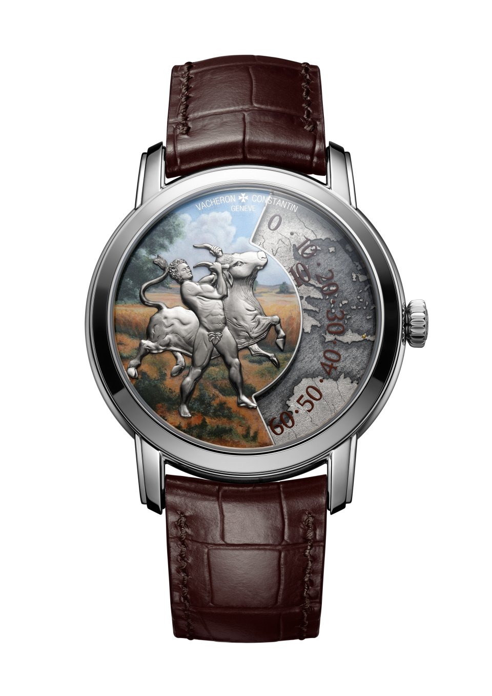 伝説によれば、エウリュステウス王は牡牛に慄き、身を隠すことのできる巨大な青銅の壺を作らせたと言われています。本作では、ミニアチュール・ペインティングのエナメルの色彩を、ブラウンのアリゲーターストラップが引き立てます。