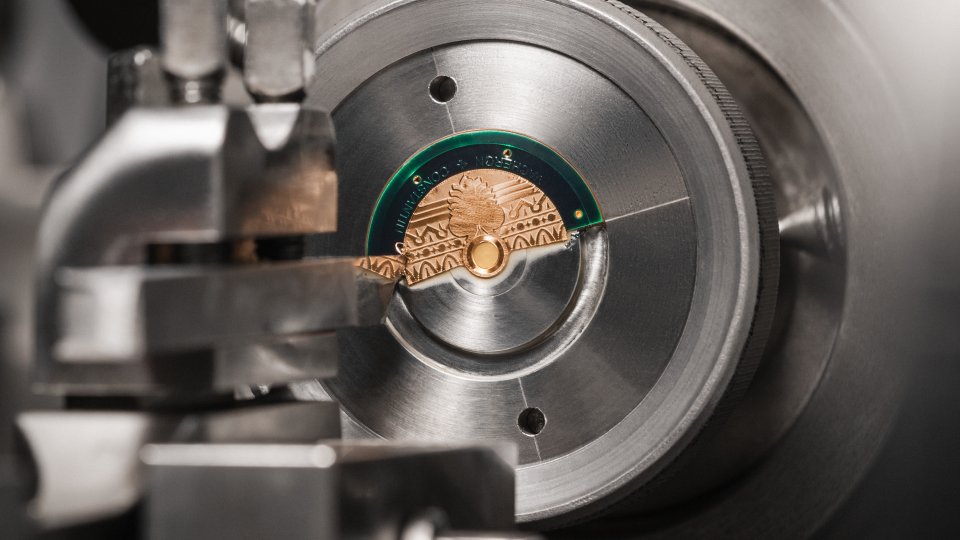 さらに、22Kゴールド製ローターには、古代ギリシャの建築に見られるフリーズ(帯状の装飾帯)に着想を得た「タペストリー」モチーフが描かれています。このモチーフは、1904年から用いられている伝統的なタペストリー機を手作業で操作して作られています。この工程は模様のテンプレートを準備するところから始まります。それを頼りに綿密に調整した旋盤を動かし、金属の表面へひと筆で描くように一気に模様を彫り上げます。