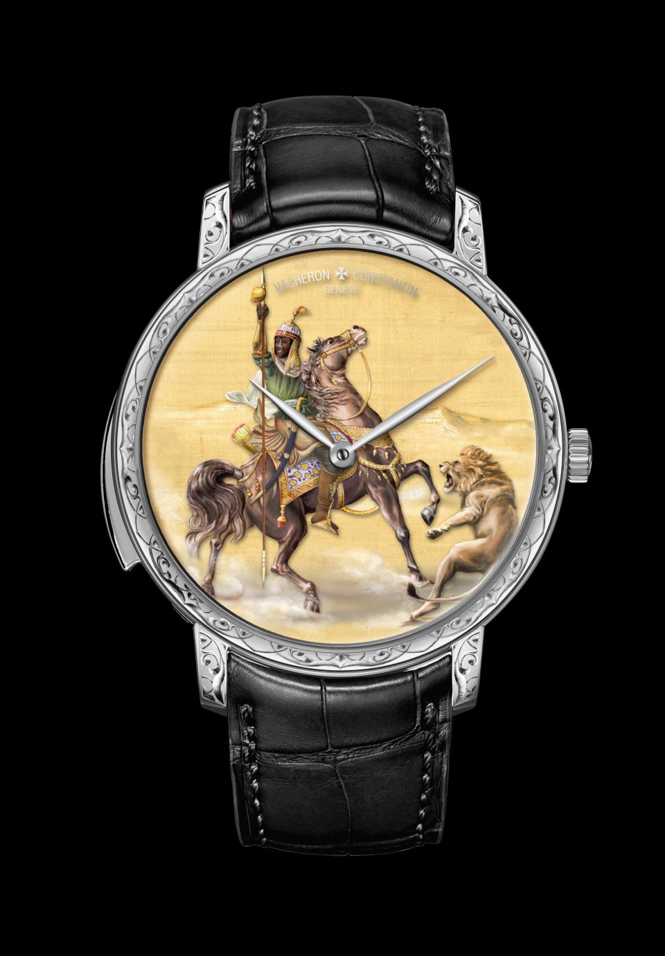 この場面は、彼の生涯を題材とした「アンタル物語」で語られる冒険のひとつです。手作業でエングレービングを施した砂漠を背景に、エナメルのミニアチュール・ペインティングで細部まで緻密に描かれた情景は気品と強さを感じさせます。18Kホワイトゴールドのケースとバックルには、タイユ・ドゥース(線彫り)技法を用いてアラベスク模様が施されています。