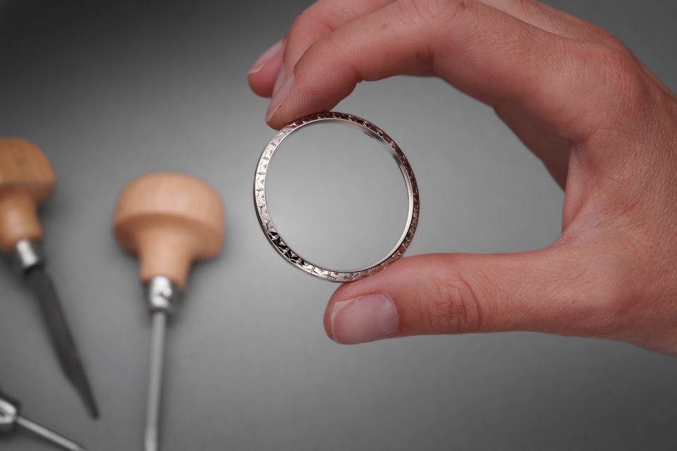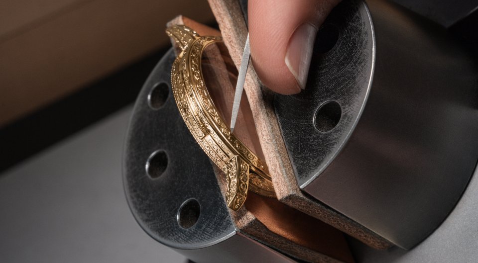 深さわずか0.1~0.2mmの細かな切り込みを金属に何千と施して得られる壮麗な模様は、ケース本体とバックルで約160時間の作業を要しました。