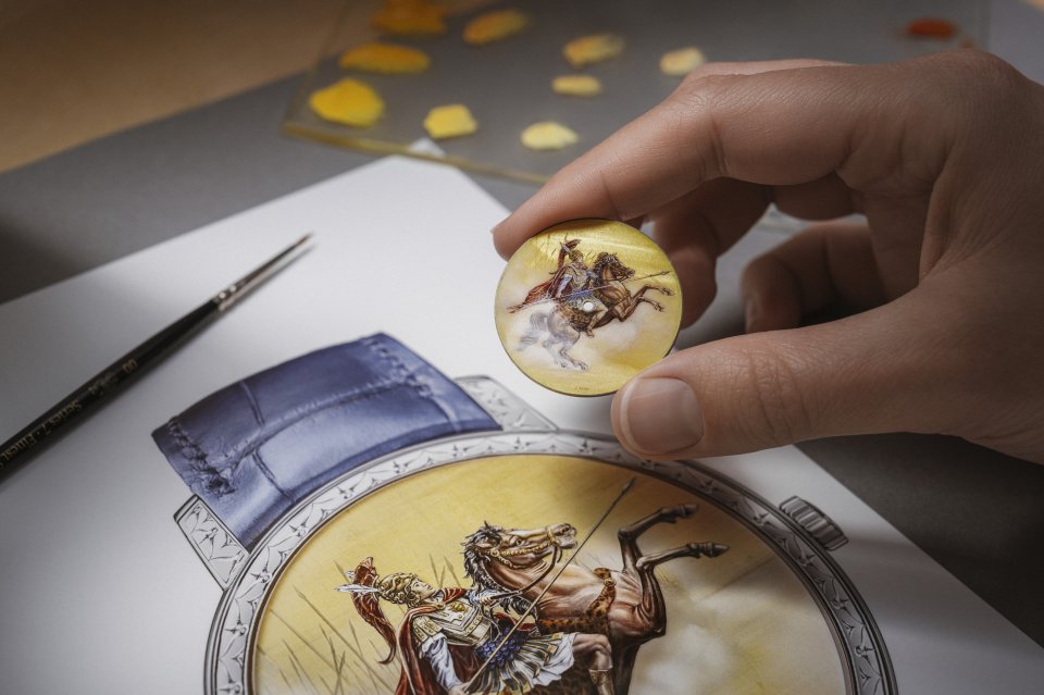 『エングレービングとグラン・フー・エナメルのミニアチュール・ペインティングは、それぞれ単体でも極めて高度な技術が求められます。これらをひとつのダイヤルに組み合わせることは、大きな挑戦となりました。エングレービングは究極の正確さと、軽やかなタッチが必要とされます。創作において目指したのは、背景がひと目でその場所を想起させ、かつ英雄の姿の邪魔をしないようにすることです。エナメル職人の作業は、エングレービングの完成を待って始められます。人物像を微細なディテールまで表現するには、緻密な筆づかいが求められ、また何層にも色を重ねる必要があります。そして1層ごとに高温で焼成しなければなりません。エナメルの工程におけるごく小さな判断ミスによって、ダイヤルが台無しになることもあります。それまでに費やした20時間ものエングレービング作業を無に帰してしまうこともありえます。ヴァシュロン・コンスタンタンは自社にメティエ・ダールの工房を擁する数少ない時計メゾンのひとつです。そのおかげで熟練の職人たちは緊密に連携し、異なる技法の組み合わせを実現しています。また、専門家が技巧をさらに深めるためにアイデアを交換する環境が培われています。』