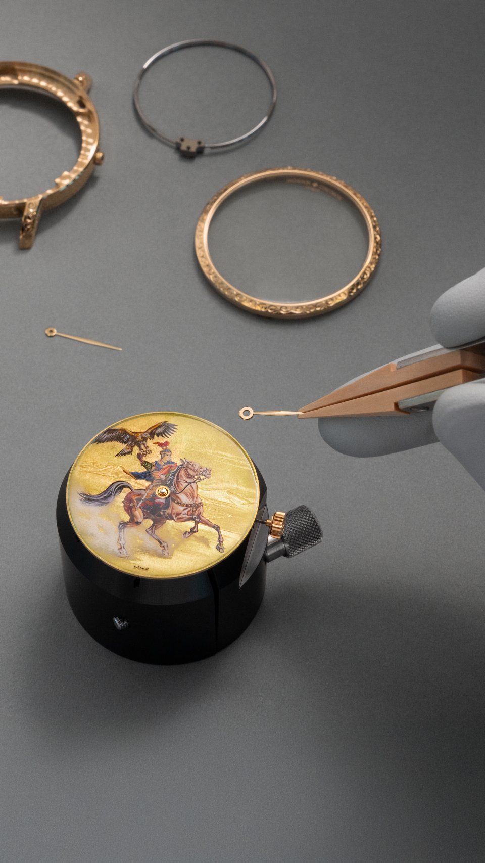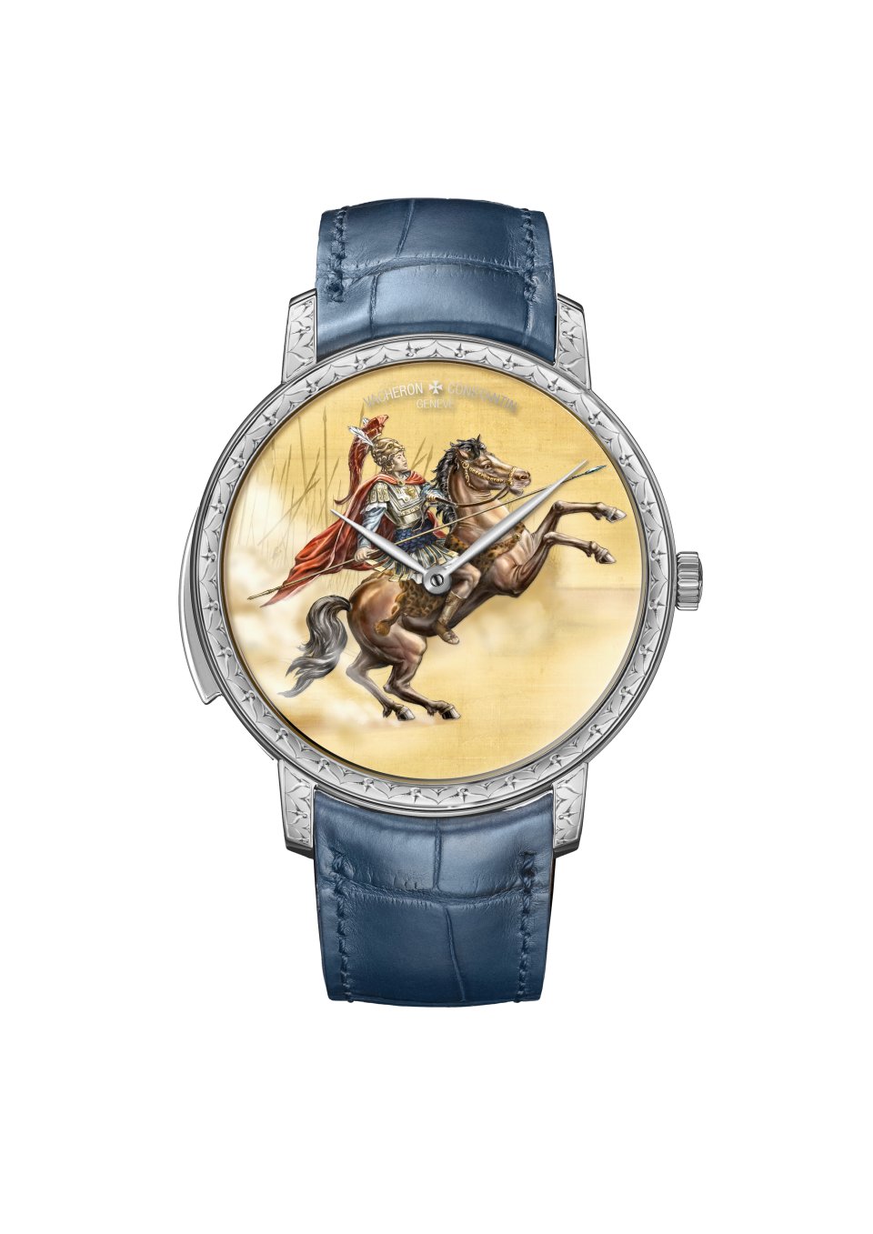 18Kイエローゴールド製ダイヤルは、背景にアレクサンダー大王率いる軍勢の槍をモチーフにした模様がタイユ・ドゥース(線彫り)技法で描かれています。一部に柔らかなぼかしを加え、愛馬ブケファロスに跨って戦場を駆けるアレクサンダーの姿により一層の躍動感と力強さを生み出しています。エナメルのミニアチュール・ペインティングによって描かれたこの情景は、精緻な細部と鮮やかな色彩を特徴とします。