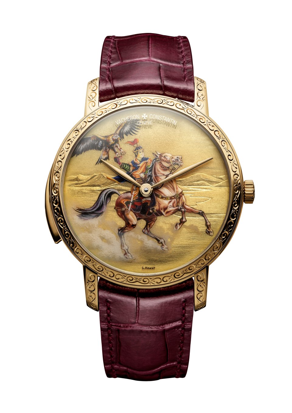 馬の蹄が立てる土埃が、俊敏さと力強さを伝えています。18Kイエローゴールドのケースとバックルには、モンゴルの伝統模様に着想を得たモチーフが手作業のエングレービングで施されています。
