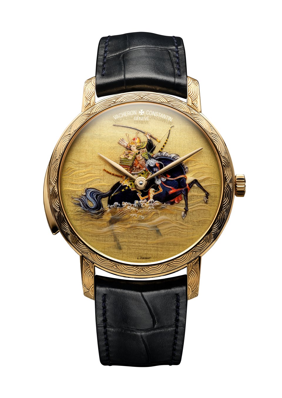 18Kイエローゴールド製ダイヤルには、「藤戸の戦い」で、盛綱が兵を率いて海をわたった重要な場面が描かれています。
