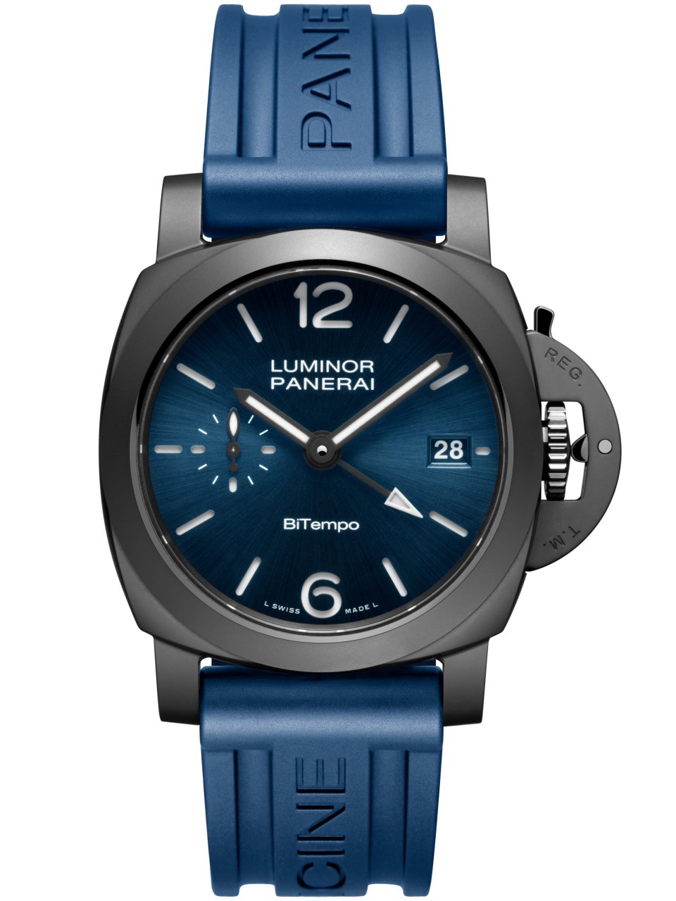 PAM01783は、ブラックケースとブルーダイヤルの印象的な組み合わせに加え、数字、マーカー、針にホワイトのスーパールミノバ®X2を塗布することで、優れた視認性を実現しています。文字盤には、イタリア語で「デュアルタイム」を意味する「BiTempo」の刻印がさりげなくあしらわれ、パネライのイタリアの伝統を想起させます。