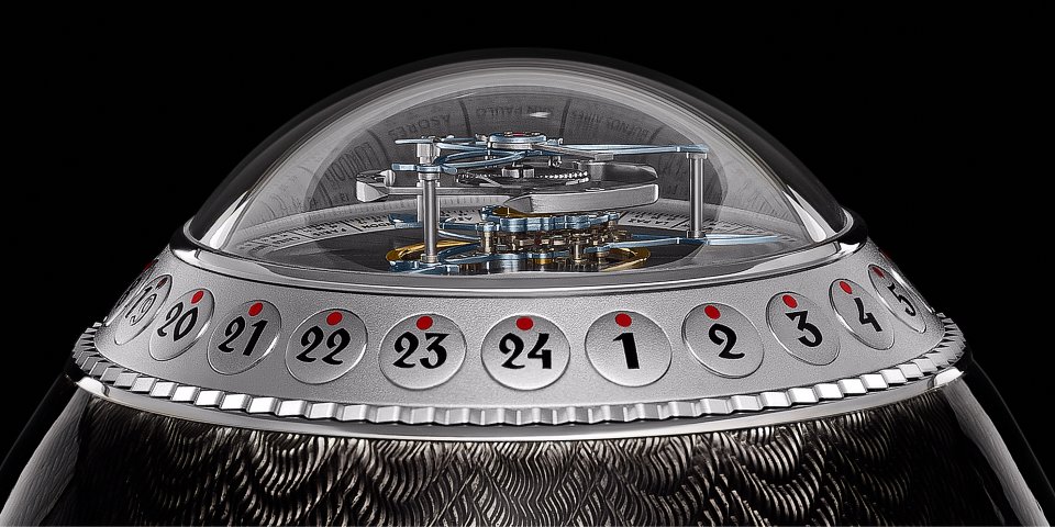 ミラーポリッシュ仕上げのステンレススチール製ベース、その上に手彫りギョーシェと半透明のホットエナメルで装飾されたシルバー製ケース、トゥールビヨンと時刻表示を覆うドーム型サファイアクリスタルという、3つの主要パートで構成されています。