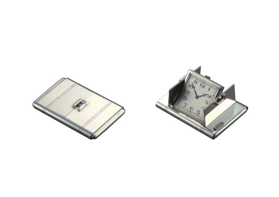 ヴァシュロン・コンスタンタンは、創立時からこの課題に向き合っています。1829年、ジャック=バルテルミー・ヴァシュロンは、フランソワ・コンスタンタンに宛てて、「私たちは、競合他社が販売する同種の製品よりも確実に優れたものになるよう細心の注意を払って、バージ脱進機を備えた薄型時計をいくつか開発することが賢明だと考えた」と、書いています。メゾンは20世紀には、薄さの限界に挑戦し、可能性を押し広げてきました。1928年に登場したいわゆる「サプライズ」ウォッチ、つまりシャッター式の腕時計は特筆に値します。一見すると旅行にぴったりの優雅で細身のアクセサリーという印象なのですが、ケースの両端に位置するボタンを押すと、ヒンジ付きのシャッターの裏に隠されたダイヤルが現れる仕組みです(下の画像)。