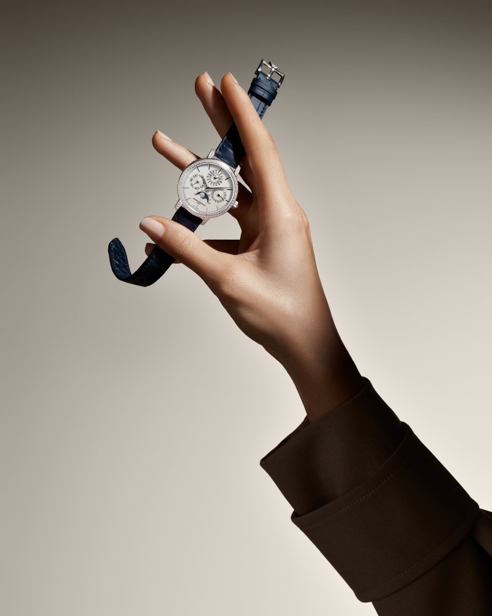 ムーブメントの構造に備わる技術的な優雅さと完璧な仕上げは、「トラディショナル・エクストラフラット・パーペチュアルカレンダー」の洗練された美学に見事に調和しています。直径36.5mmのケースは、性別を問わずあらゆる方の手首にフィットする理想的なデザインで、1983年に誕生した「リファレンス43031」のサイズから着想を得ています。
