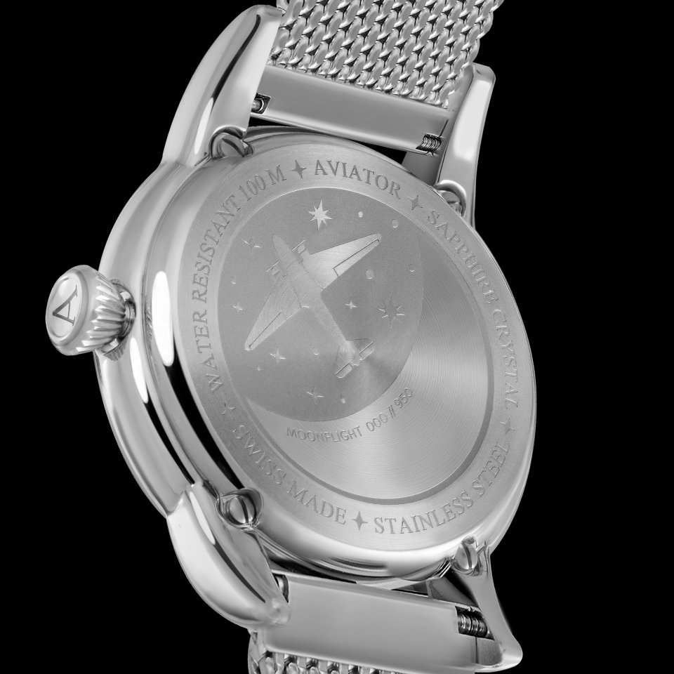 スイスウォッチブランドAviatorの「Moonflight」モデルは、飛行機の中から見た夜空をフェイス上にイメージしています。時計を見る度、旅行気分を味わえる腕時計。時代を超えて輝く、空のロマンス。