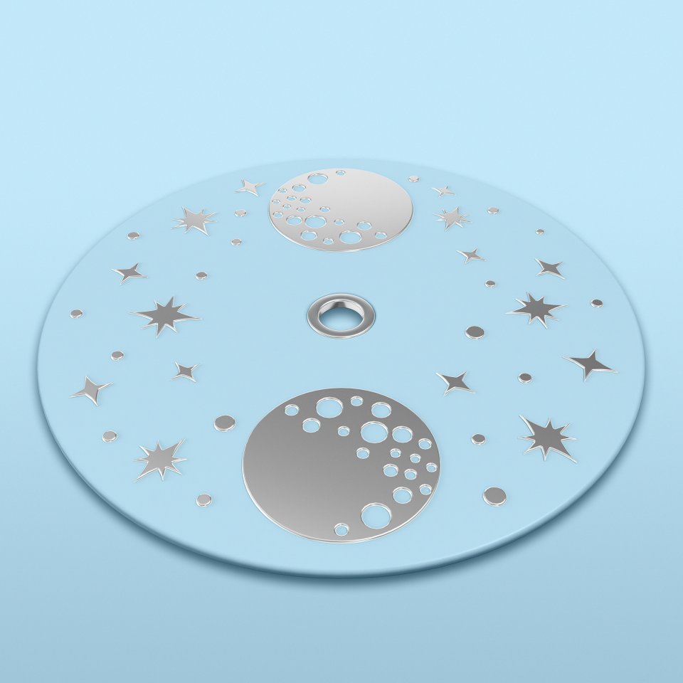 月の光が夜空を彩るように、ムーンフライトのダイヤルはスカイブルーやグレイッシュトーンなど空と時間の移ろいを映し出す多彩なカラーパレットで展開。特に“Sky Blue”は、夜明け前の一瞬の魔法のような色を再現しています。静けさと気品を併せ持つその色は、まさに“空の宝石”です。