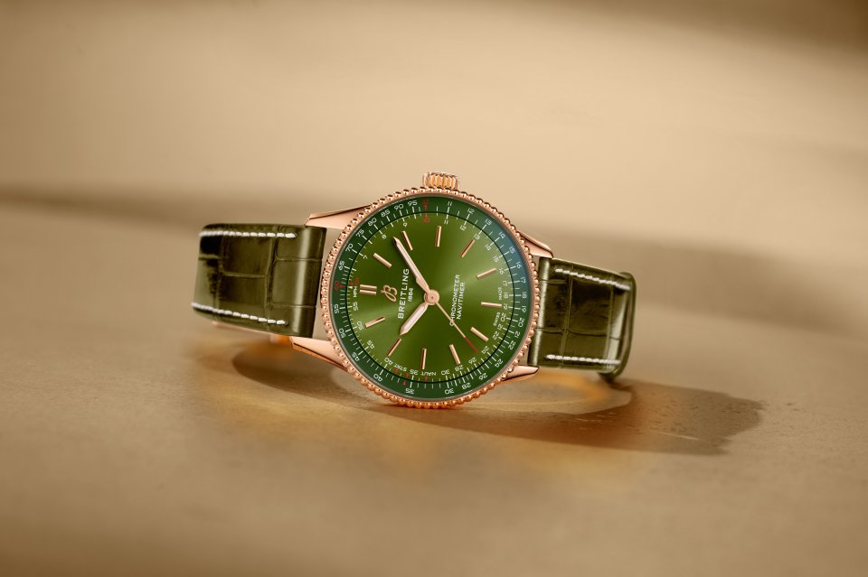 ナビタイマー オートマチック 36は、グリーンダイヤルとマッチするカラーの計算尺外周を組み合わせた、統一感のあるワントーンのフェイスに仕上げられています。時刻表示のみの自動巻きブライトリング キャリバー 17を搭載しています。ミッドサイズの36mmケース径は、すっきりとした時刻表示のみのレイアウトで、小ぶりな時計を好む方にとって理想的なバランスを実現しています。