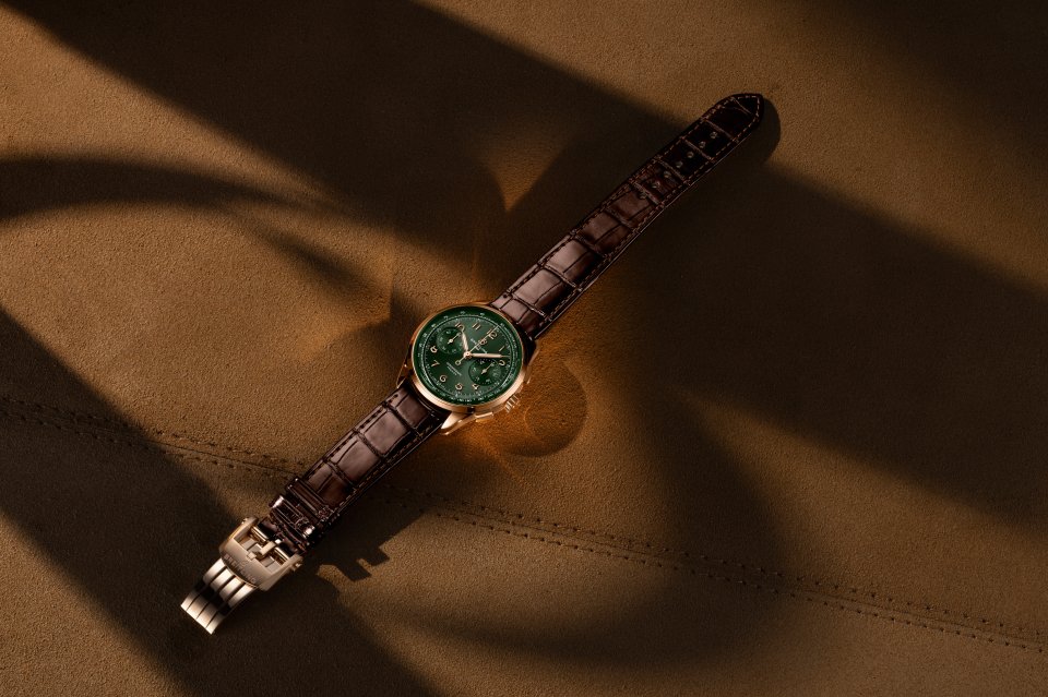 このモデルには、文字盤に合わせたグリーンのアリゲーターストラップとレッドゴールド製タンタイプバックルが付いています。
