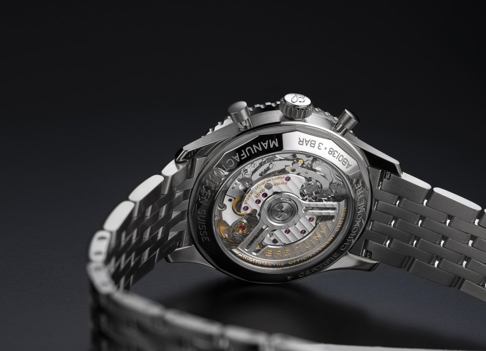 搭載されるのはもちろんマニュファクチュール・クロノグラフ、ブライトリング キャリバー 01。サファイアクリスタル・ケースバック越しに、その精緻な動きを眺めていただくことが可能です。