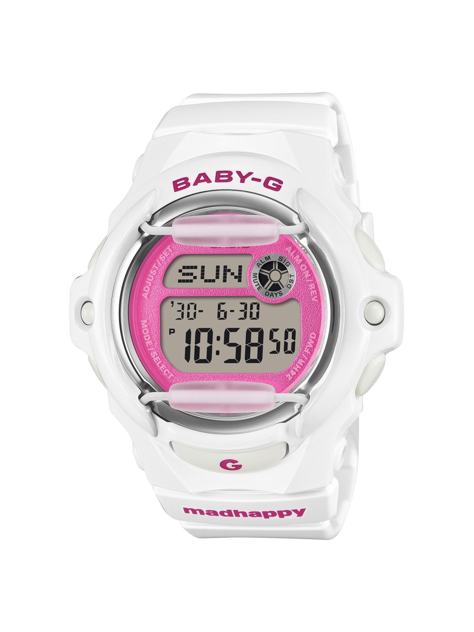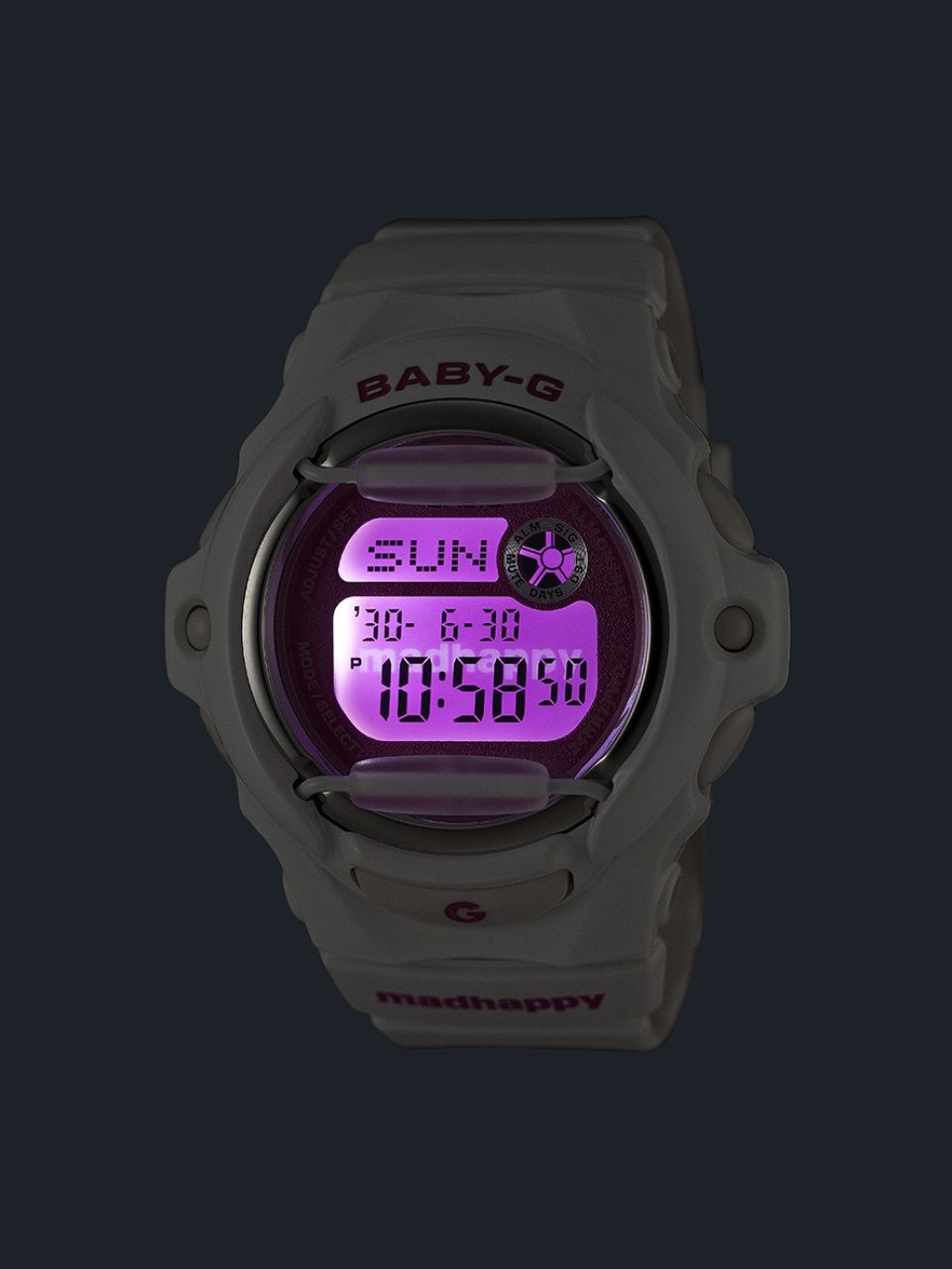 今回発売する『BG-169MH-7』は、アパレルブランド「Madhappy」と“BABY-G”による特別な限定コラボレーションモデルです。「BG-169」の持つレトロフューチャーなフォルムを生かし「Madhappy」ならではの遊び心あふれる楽しいムードを落とし込んだデザインに仕上げています。