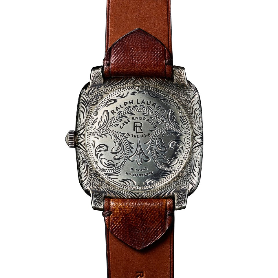 アメリカン ウエスタン ウォッチ コレクションのモデルにおいて、ローレン氏は西洋の伝統工芸に伝わる有機的なモチーフを洗練されたクッション型シルエットで再解釈しました。アンティーク調スターリングシルバーと温かみのある18金ゴールドの2種類を展開し、磨き上げられたヴァケッタレザーストラップを組み合わせた。ラルフ・ローレンは世界中の熟練職人との協業により、時計の各部品において最高品質と真正性を確保している。