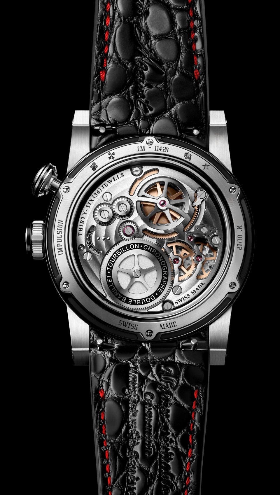 自社製の手巻きムーブメント Cal.LM114)を搭載。ドーム型のサファイアクリスタル風防から、文字盤側に配置されたクロノグラフ機構とトゥールビヨンの機能美を同時に愉しめます。