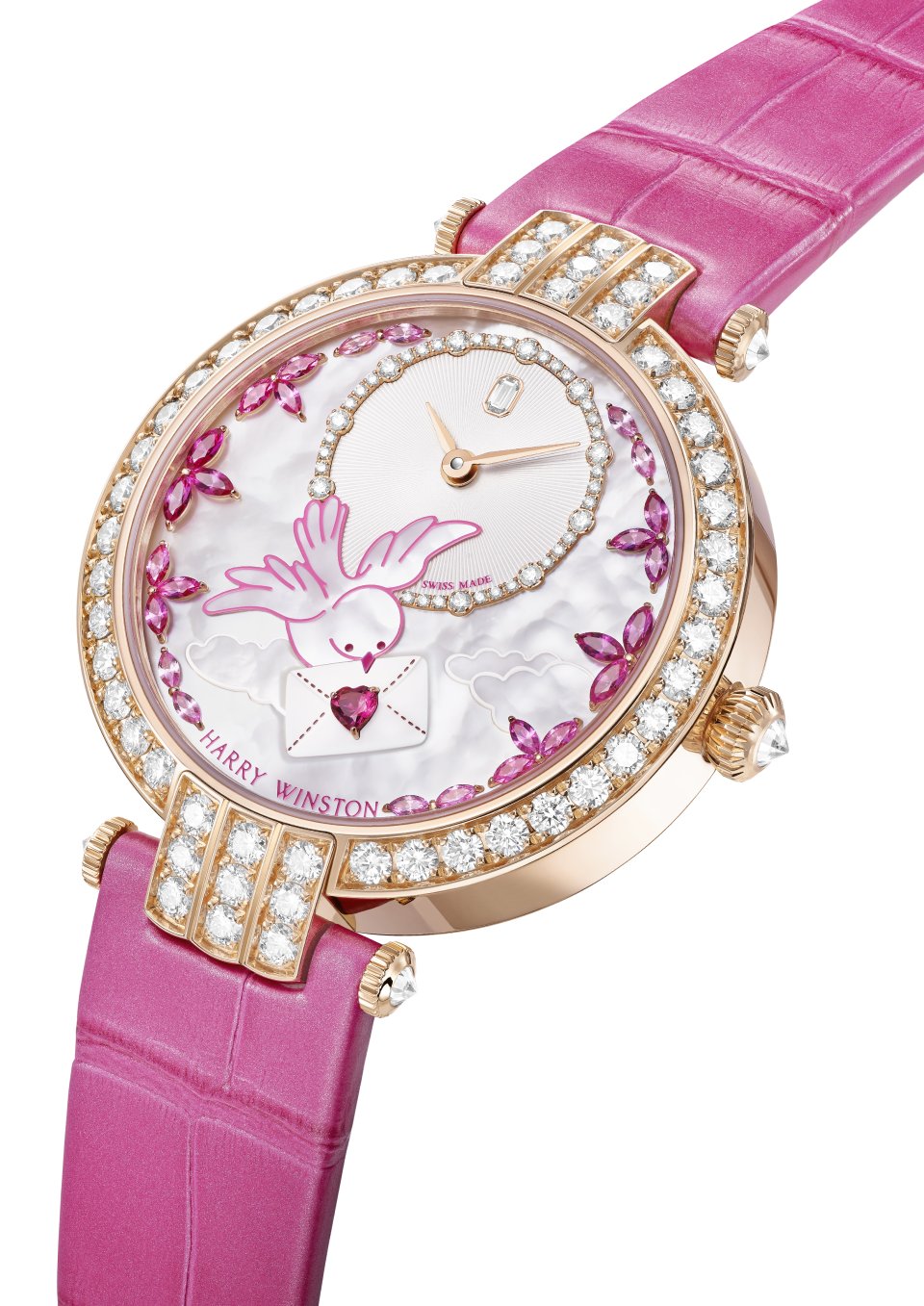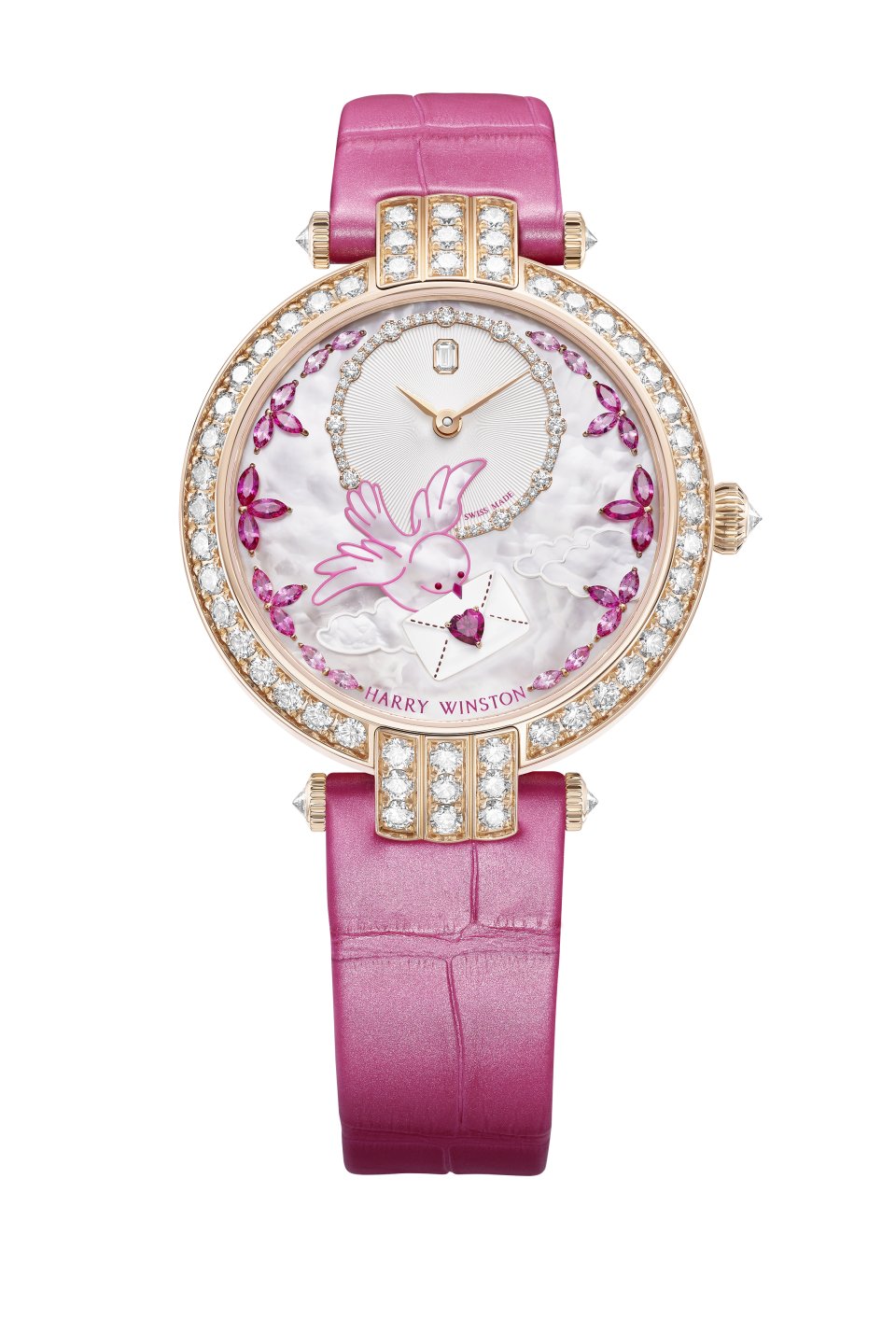 愛のメッセージを届けるために空中を舞う、かわいらしい小鳥。ピンクのラッカーで縁取られた白い小鳥はくちばしに封筒をくわえ、時分を示すカウンターの上を羽ばたいて、バレンタインデーに間に合うように急いで手紙を届けようとしているのです。手紙の内容は秘密ですが、ふっくらとした白いラッカー仕上げの封筒には、情熱的な想いが込められています。愛という普遍の言語を象徴するように、封筒には赤いハート形のルビーが封印として輝いています。