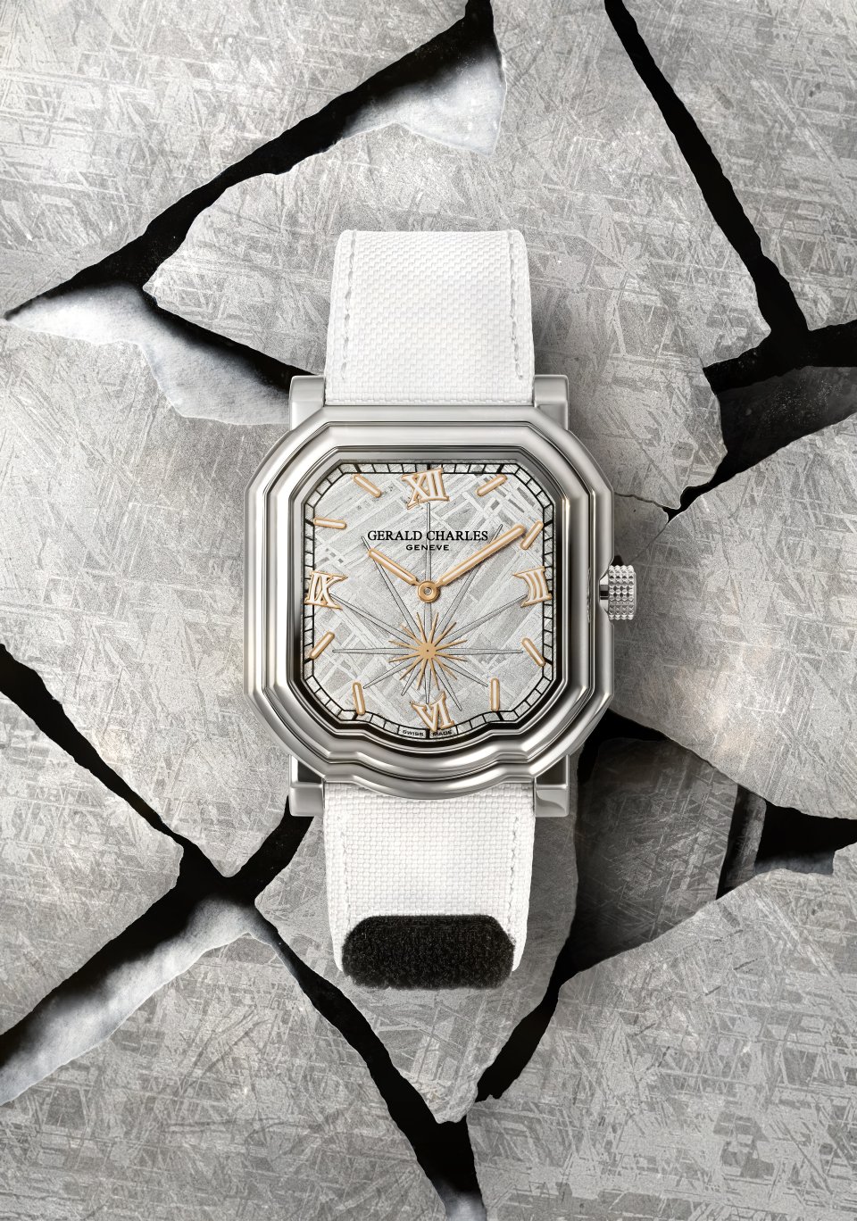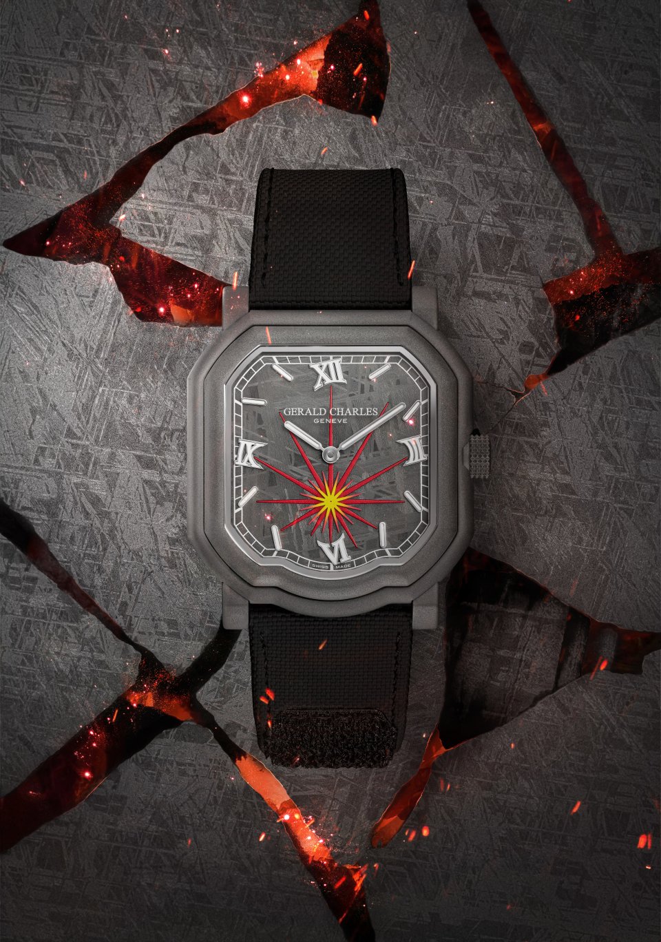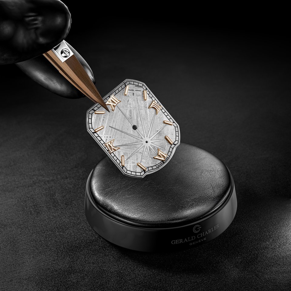 このサヴォアフェール ―マエストロ特有の複雑なケースジオメトリーに合わせてメテオライトを成形し、6時位置に爆発の光線を外科手術のような精度で彫り込む技――は、ジェラルド・チャールズの時計製造の中でも、最も高度な表現のひとつを体現しています。
