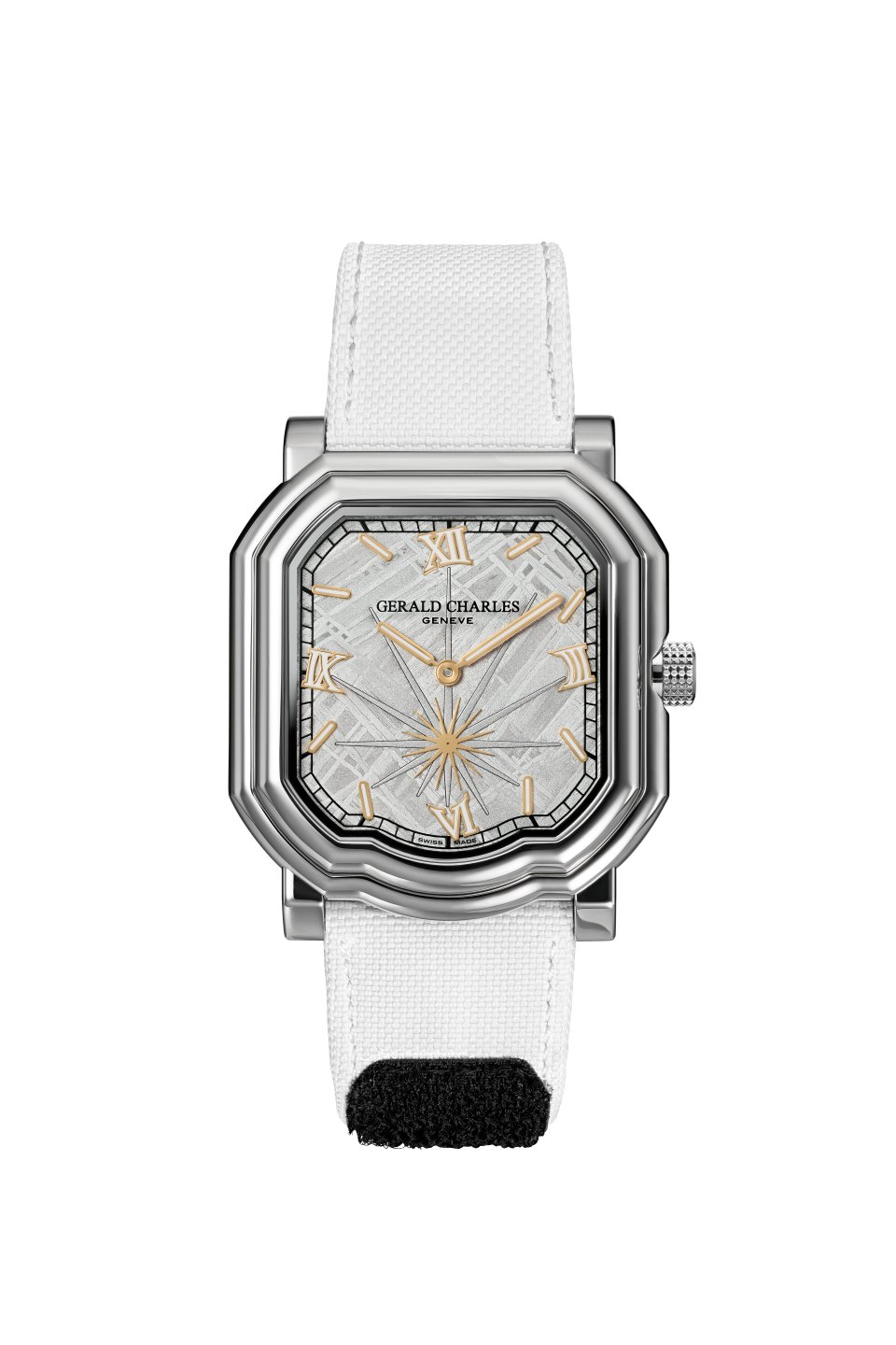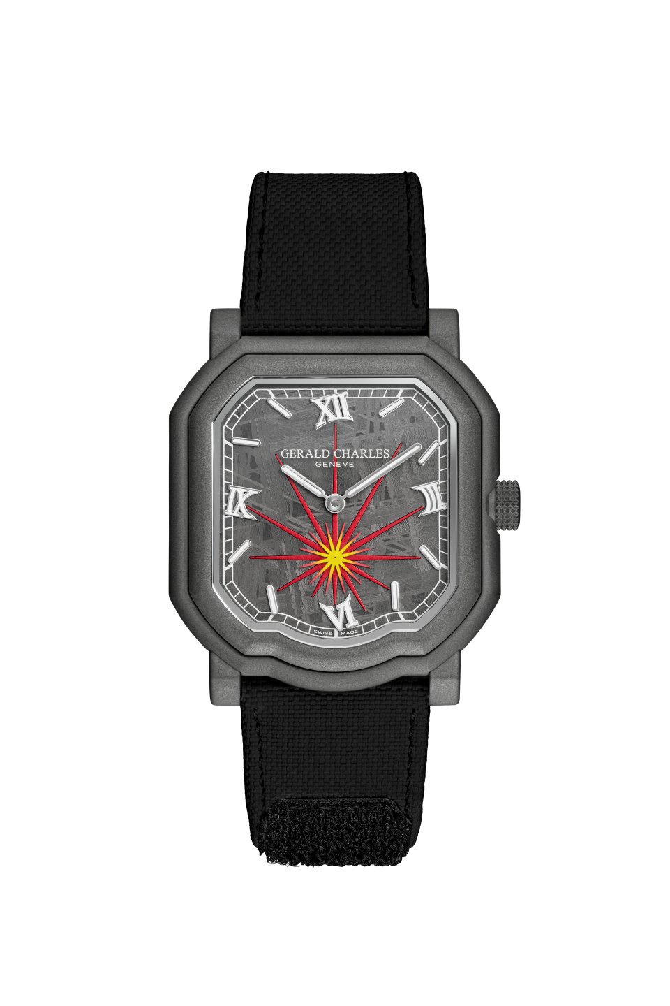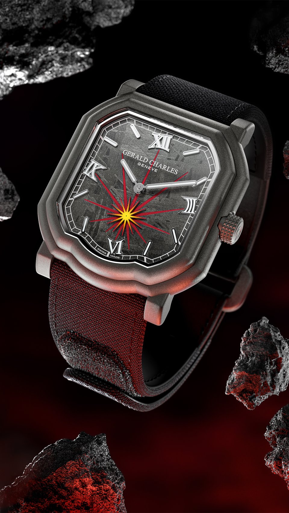 このサヴォアフェール ―マエストロ特有の複雑なケースジオメトリーに合わせてメテオライトを成形し、6時位置に爆発の光線を外科手術のような精度で彫り込む技――は、ジェラルド・チャールズの時計製造の中でも、最も高度な表現のひとつを体現しています。