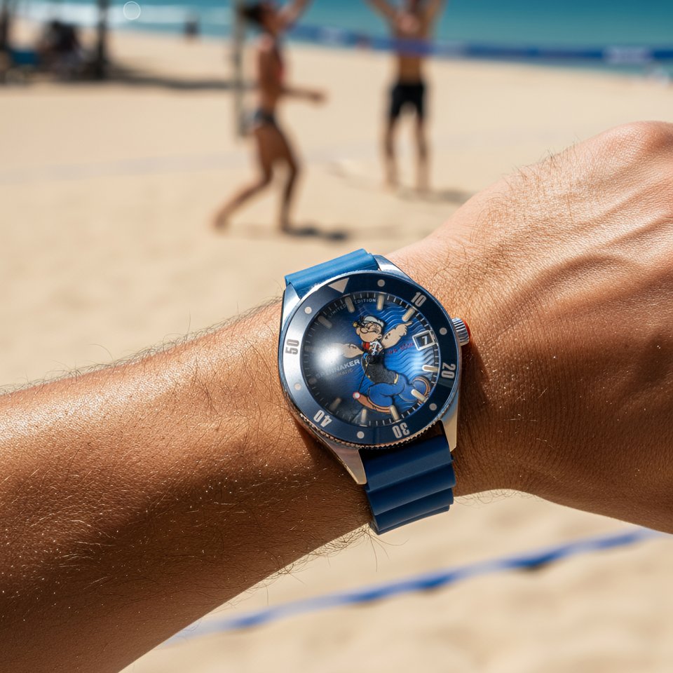 本作のベースとなるチャレンジャーは、過酷な環境下でも信頼できる性能と力強いデザインを兼ね備えた、スピニカーを象徴するダイバーズウォッチです。その名が示す通り、挑戦を恐れず前進する精神を体現しており、この“チャレンジスピリット”は、逆境に立ち向かい、自らの力で道を切り拓いてきたポパイの生き様とも重なります。