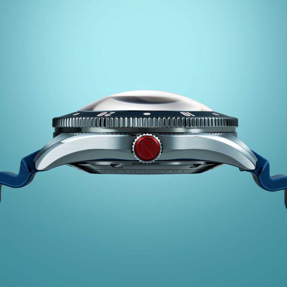 風防に、大きく突出したスーパードーム型サファイアレンズを採用。角度をつけて覗くと歪んで見えるさまは、水圧に耐えられるよう厚いガラスで構成された潜水艇の舷窓を彷彿とさせます。逆回転防止ベゼルは艷やかなセラミック製。高密度設計により30気圧もの高防水を備えています。