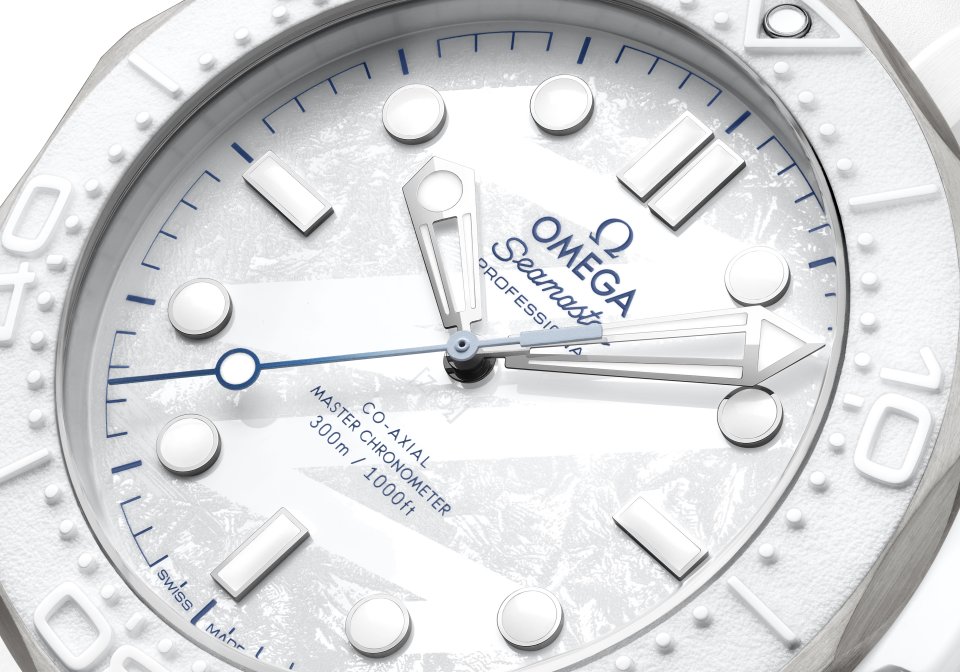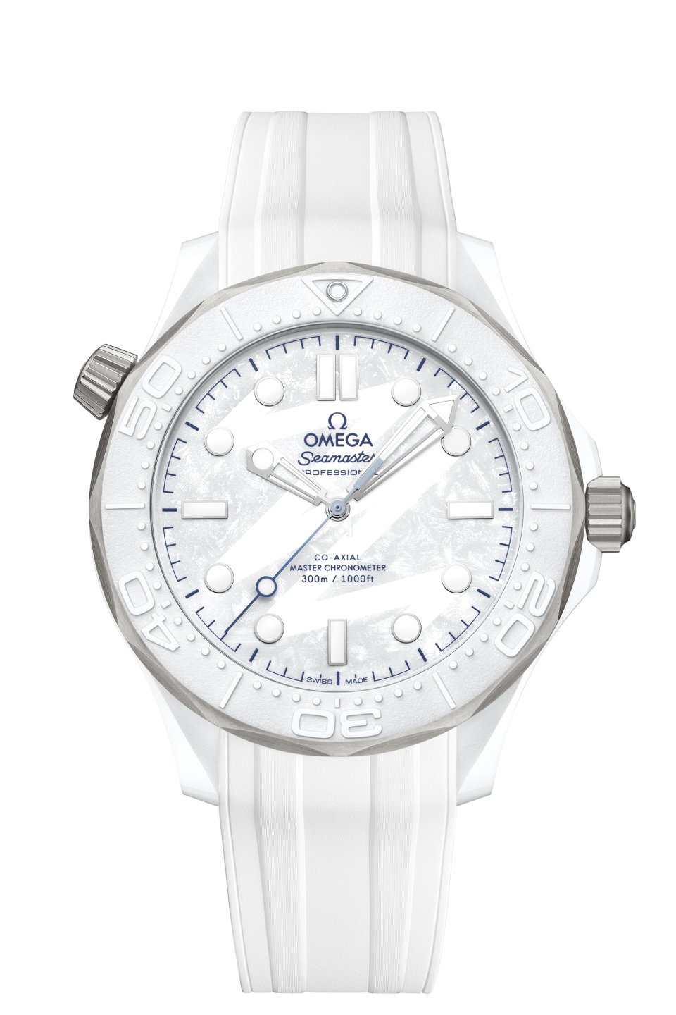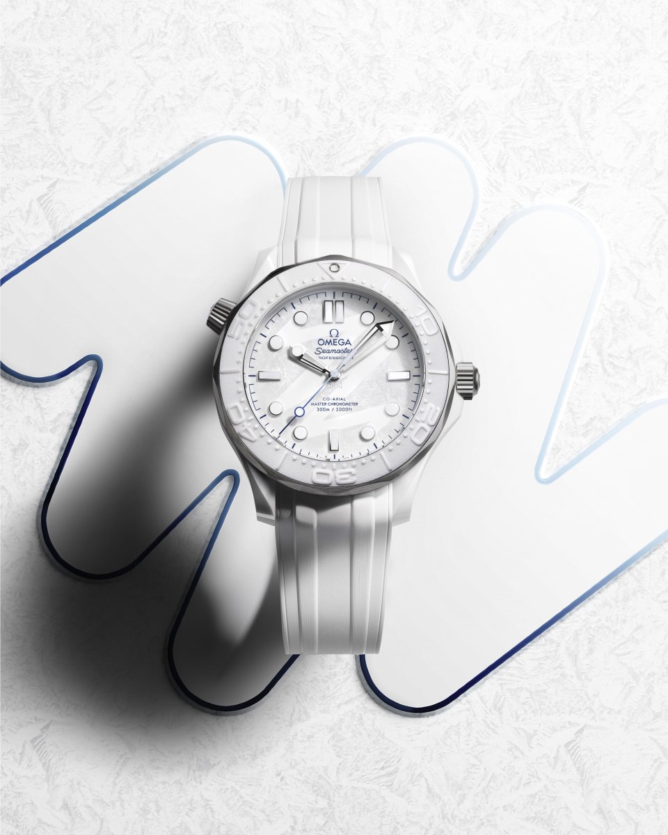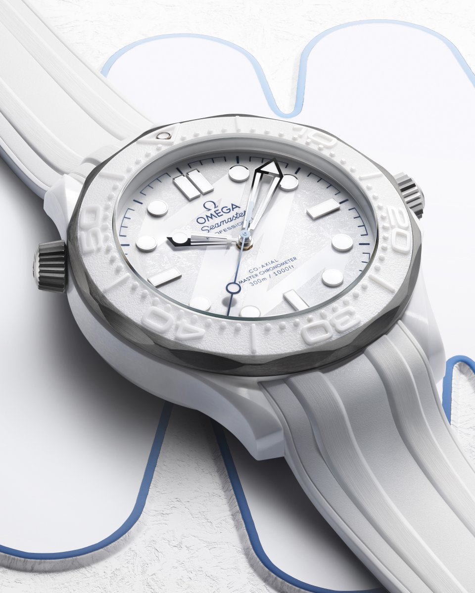 冬のイメージを表現するため、オメガはホワイトセラミックとグレード5チタンを採用しました。この2つの素材は、洗練された美しさ、軽さ、そして強度も兼ね備えています。また、それぞれに多彩な仕上げが施されており、デザイン全体に絶妙なコントラストを生み出しています。