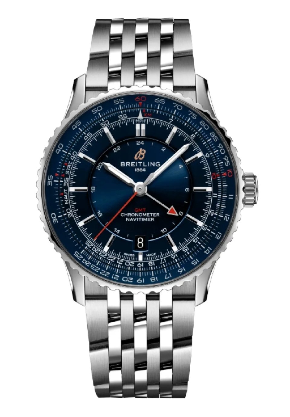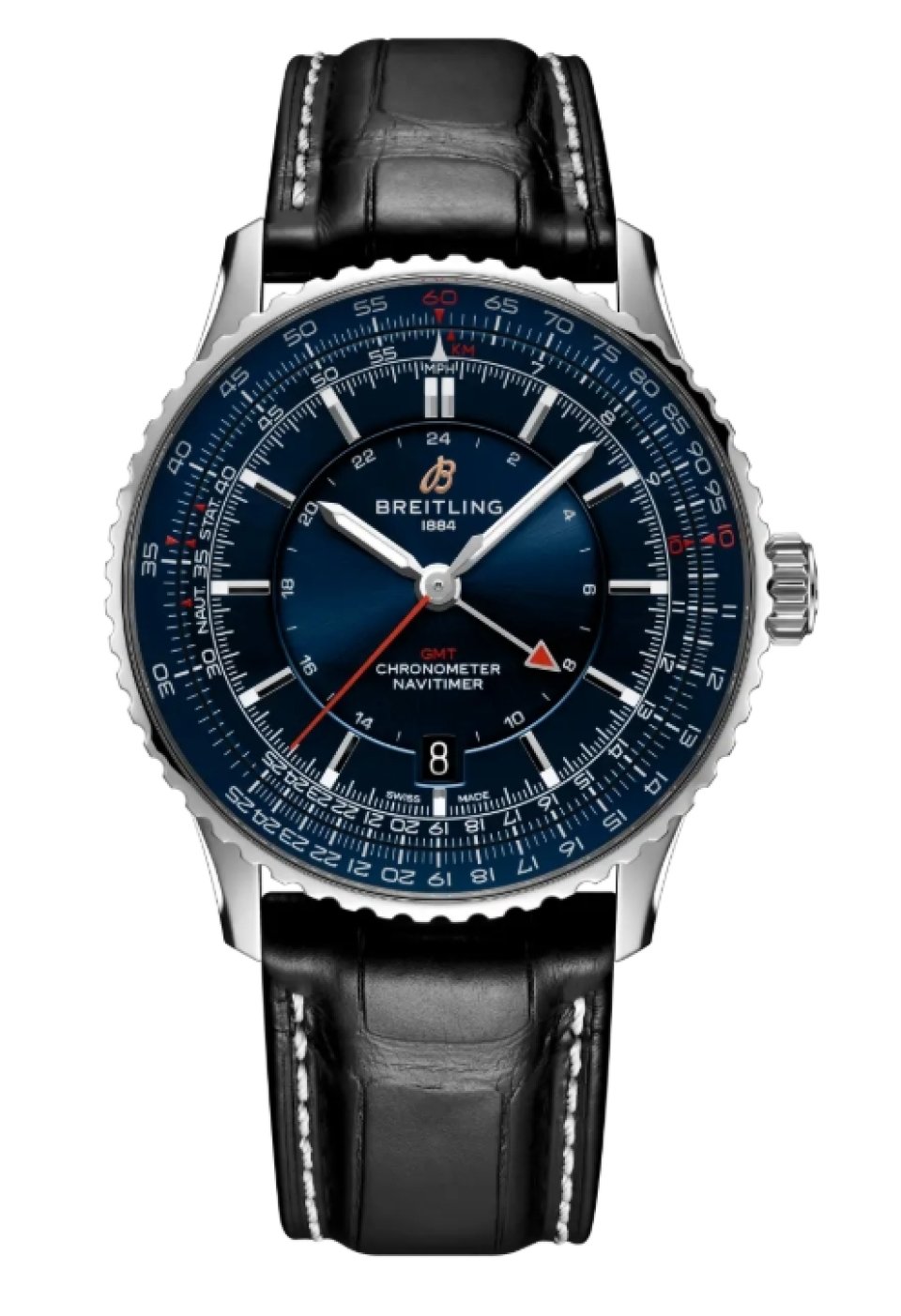 70年以上にわたり、ブライトリングの象徴として名高いナビタイマー。1952年にパイロットのための計器として生まれ、その後、このモデルを手にしたすべての人にとって、人生を共に歩む大切な存在になりました。ナビタイマー オートマチック GMT 41 は、アイコニックな航空用回転計算尺はそのままに、クロノグラフに代えてGMT機能を搭載することで、シンプルなダイヤル構成になっています。GMT用24時間目盛りを中央に配置しながらも、複雑な計算尺を際立たせながら、全体的な美しさを引き締めています。