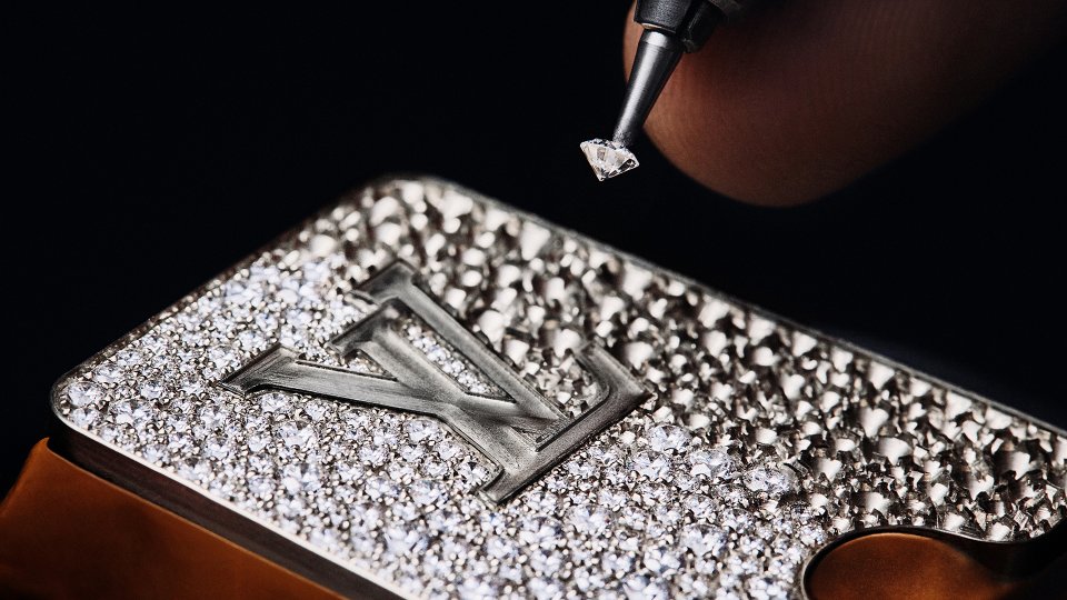 手作業による精巧なギョーシェ彫りで表現されたメゾンのエンブレマティックなダミエ・パターンにダイヤモンドを散りばめた装飾は、トラックの側面に記されたアイコニックなアドレスを強調。完成までに15時間もの作業を要するギョーシェ彫りが、「ラ・ファブリク・デュ・タン ルイ・ヴィトン」のアルチザンたちの比類なき熟練の技を物語ります。