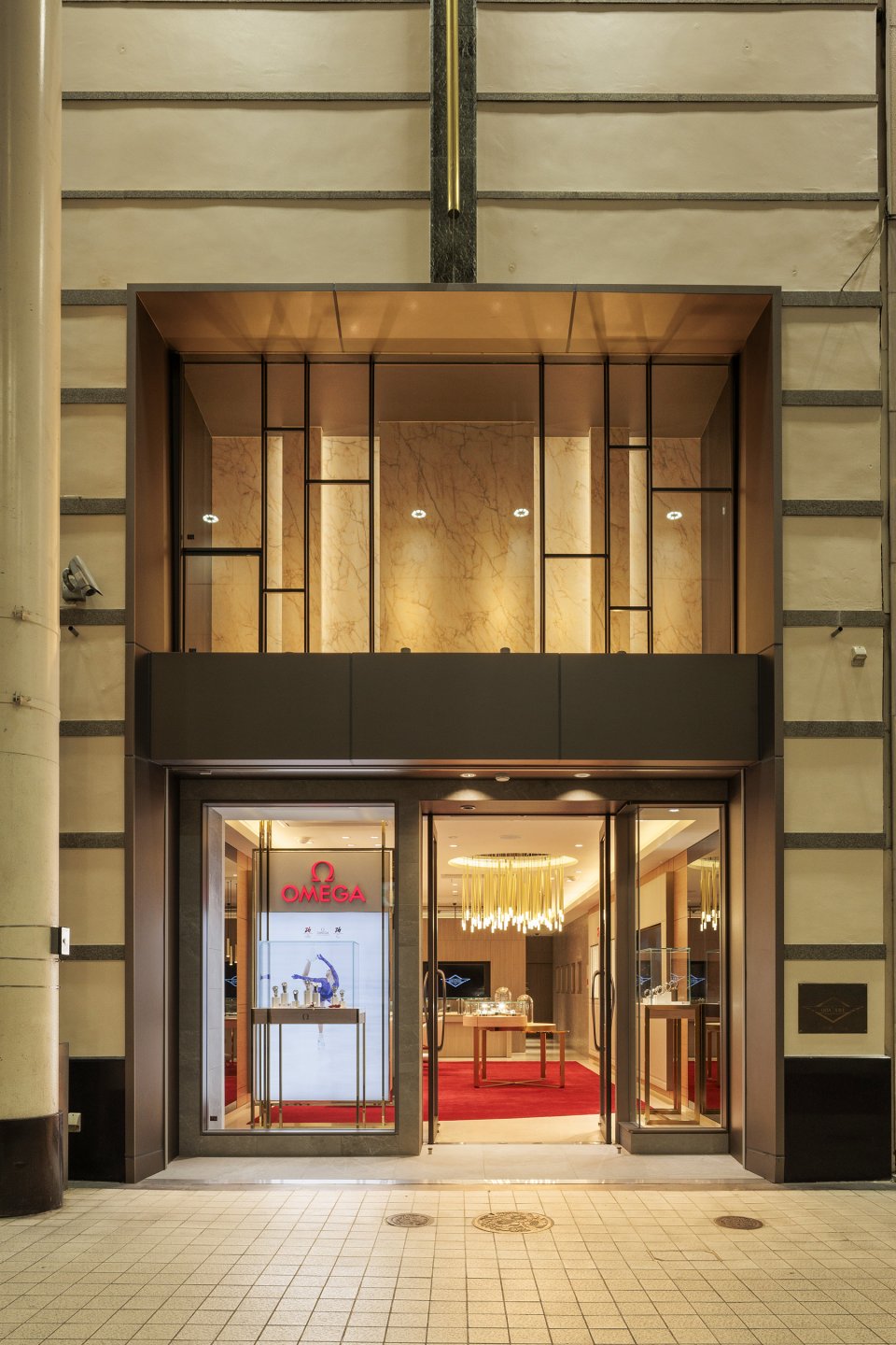 路面に面したウィンドウには最新の商品がディスプレイされ、大きなシグネーチャービジュアルが表通りからご覧いただけます。オメガのもつ華やかさと上質なエレガンスを感じていただきながら、ゆったりと寛いでブランドの世界感と時計をぜひご覧ください。