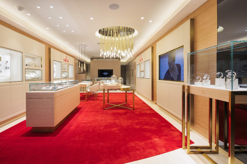 エントランスのドアを開けると、これからはじまる眩い時間を象徴するようなレッド、ホワイト、ゴールドのカラーで満たされたオメガの空間がお客様をお迎えいたします。鮮やかなレッドカーペットを敷いたフロアには、ゼブラウッドと上品なペールグレーのレザーを使用したショーケースにオメガを象徴する4つのコレクション “シーマスター”、“スピードマスター”、“コンステレーション”、“デ・ヴィル”のタイムピースが美しくディスプレイされ、時計を選ぶ楽しさを心ゆくまで感じていただけます。
