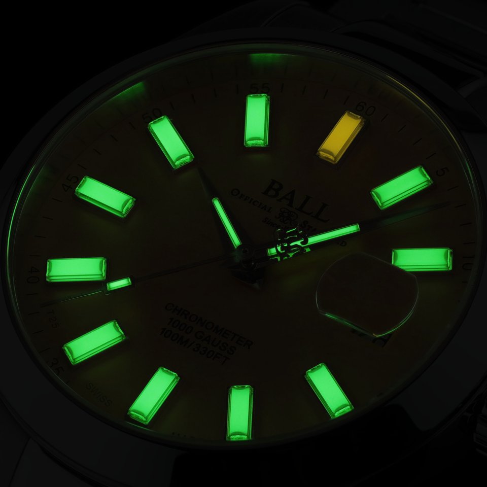 視認性という観点において、ボール ウォッチを象徴する存在が自発光マイクロ・ガスライトです。本モデルでも針および文字盤インデックスにこの夜光システムを採用。外部光源や蓄光を必要とせず、昼夜を問わず常に一定の明るさで発光し続ける特性により、暗所や不意の停電時など、瞬時に時刻を確認したい場面においても確実な判読性を確保します。これは装飾的な演出ではなく、実使用環境を重視するボールウォッチの哲学そのものを体現するディティールです。