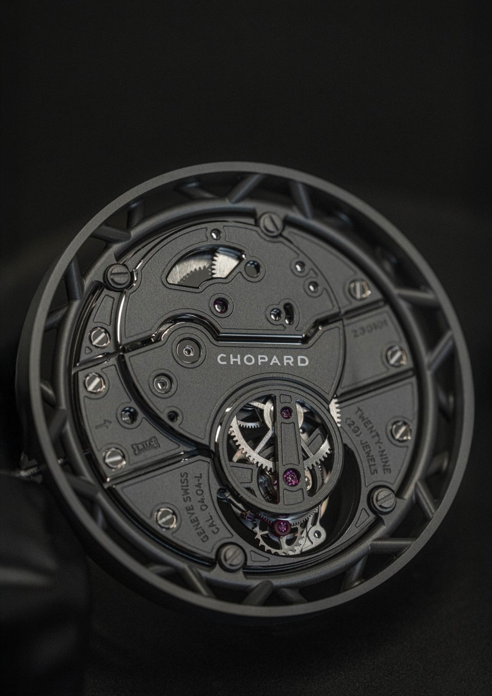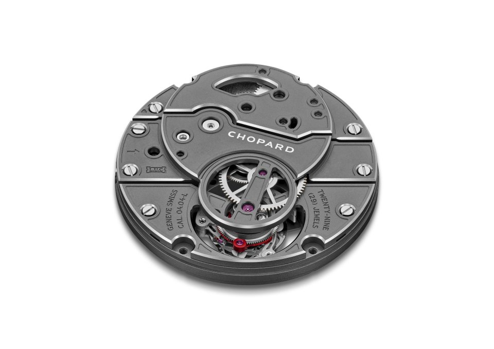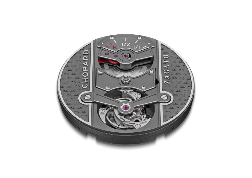 「ザガート ラボ ワン コンセプト」には、2010年に発表され、オートモーティブのメカニズムとオートオルロジュリーとの真の美的融合を体現した、ショパール マニュファクチュールの「エンジン ワン トゥールビヨン」キャリバーの進化版を搭載することでした。この新たなメカニカル“スピードマシン”は、前モデルの特徴でもあったフューエルゲージを模したパワーリザーブ表示を継承し、車のダッシュボードを彷彿させる文字盤デザインが強調されています。キャリバー「L.U.C 04.04-L」は、先代モデル(2010年発表の「L.U.C エンジン ワン」のキャリバー「L.U.C 04.01-L」搭載モデルを含む)の縦型・横型の“長方形”レイアウトとは一線を画し、ラウンドシェイプの特徴的なフォルムを採用しています。従来はジャーマンシルバー(洋銀)で製作されていたブリッジおよび地板は、セラマイズドチタン製に刷新されています。