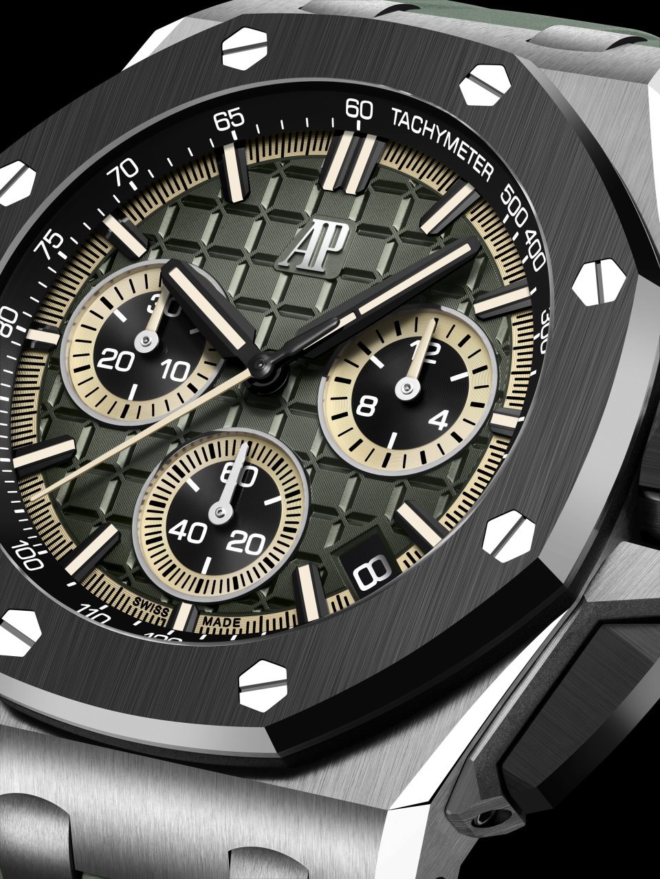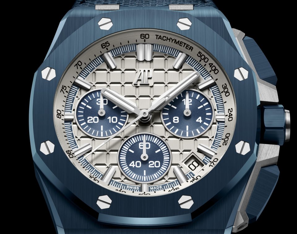 鮮やかなカラーコントラストと最先端素材の魅力にあふれた新作「ロイヤル オーク オフショア クロノグラフ」は、ブランドの技術とデザインのイノベーションにかける情熱を体現しています