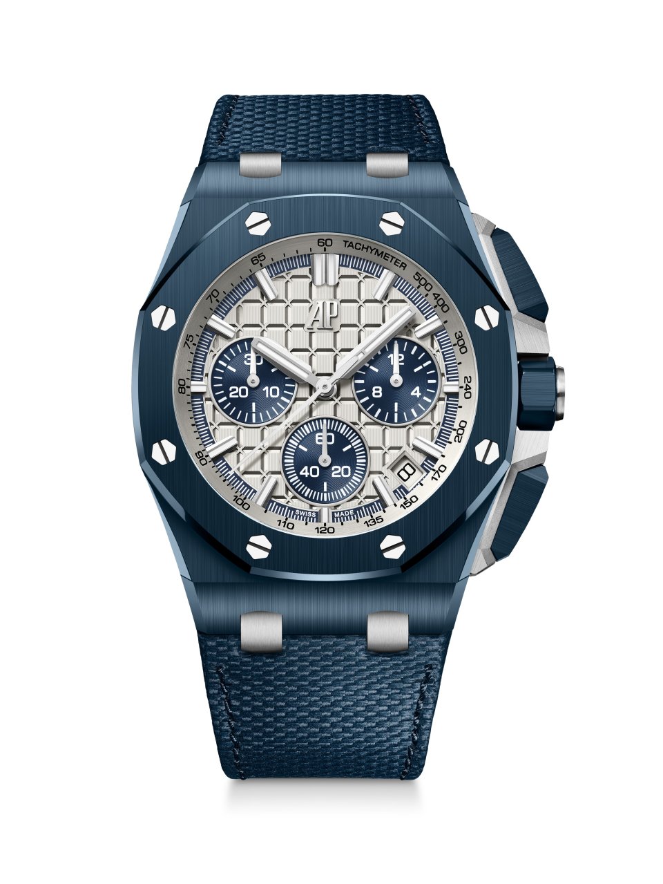 チタンに、“ナイトブルー、クラウド50”カラーまたはブラックカラーのセラミックをそれぞれ組み合わせ、素材の豊かなコントラストを際立たせたデザインが特徴のスポーティな43mmのロイヤル オーク オフショア クロノグラフ。© Courtesy of Audemars Piguet