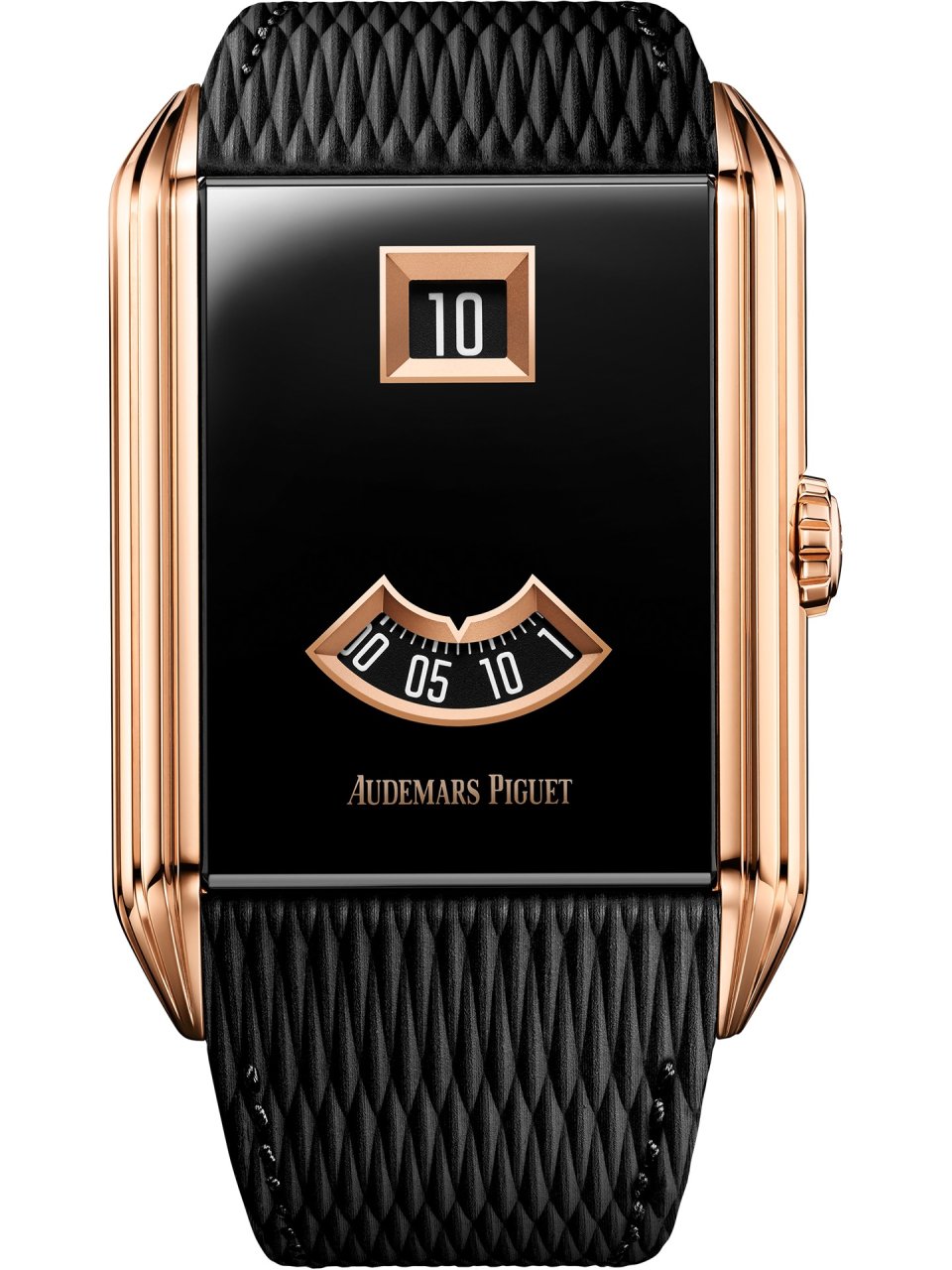 ブラックPVD加工を施したサファイアクリスタルのコンテンポラリーなツートーンデザインが特徴で、時と分の二つのゴールドフレームのアパーチャー(表示窓)には、黒地に白の数字がプリントされています。また、6時位置にはピンクゴールドカラーの「Audemars Piguet」ロゴが配されています。