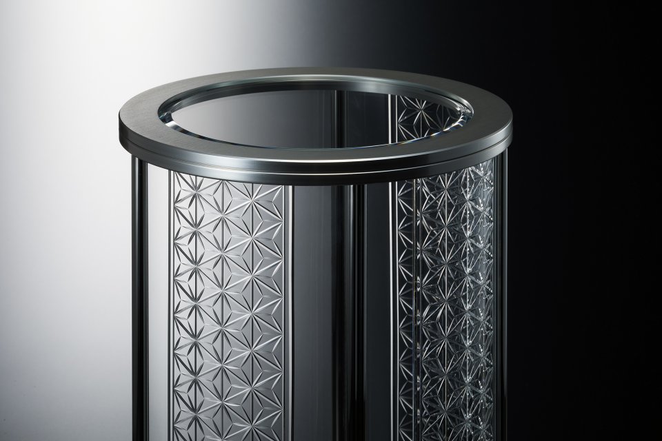 円柱形のガラスケースに大胆に施した、吉祥文様の「麻の葉」柄