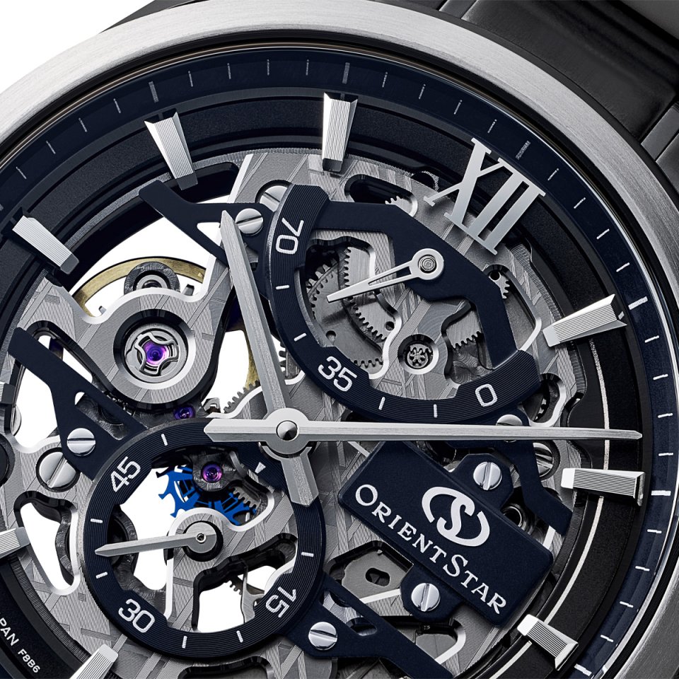 「Orient Star」新作② 75周年記念モデル「M34 F8 スケルトン ハンドワインディング」~スケルトンムーブメントにメテオライト(隕石)調の精緻な結晶模様の新仕上