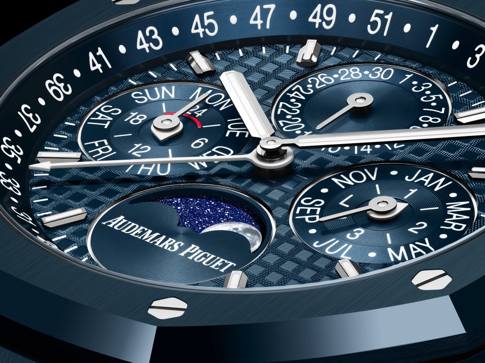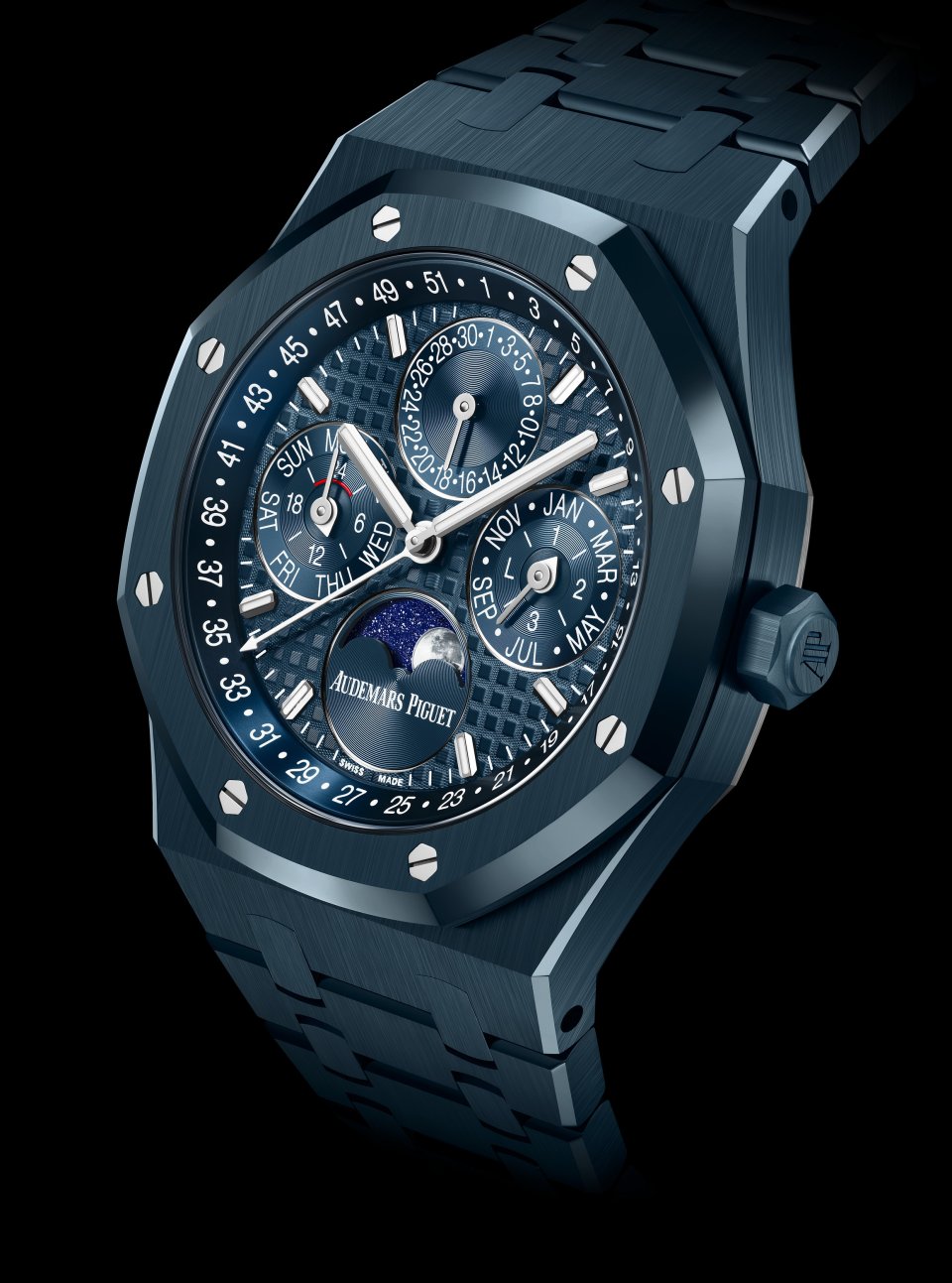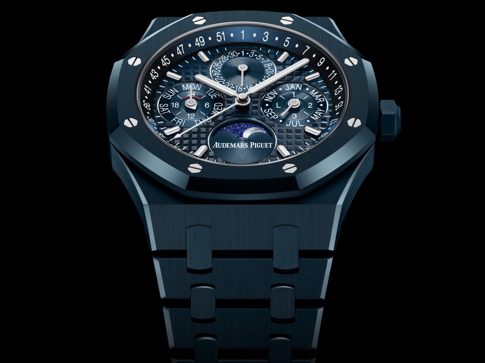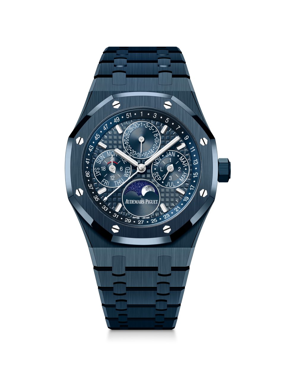 キャリバー7138を搭載する、“ナイトブルー、クラウド50”カラーをまとったロイヤル オーク パーペチュアルカレンダー。 © Courtesy of Audemars Piguet.
