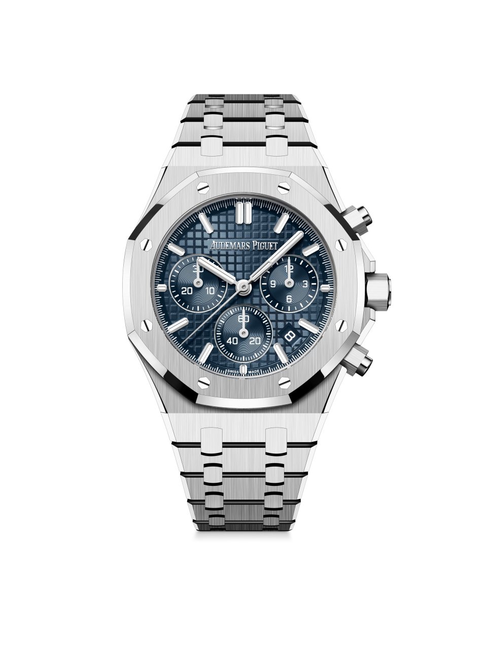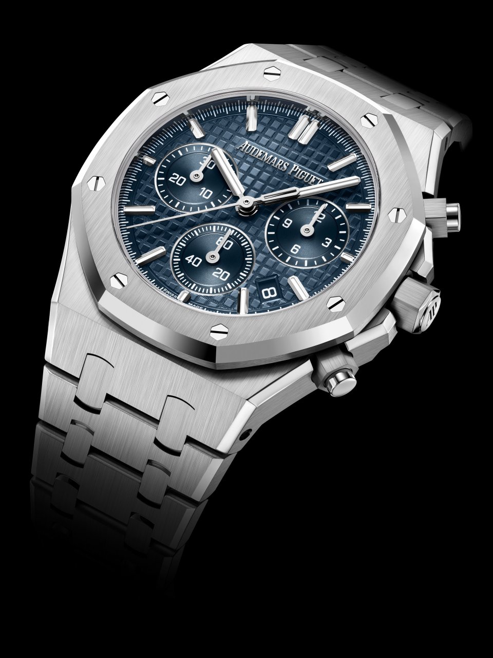 1つ目のステンレススティールのケースとブレスレットのモデルには、アイコニックな「ナイトブルー、クラウド50」のグランドタペストリーダイヤルを採用し、ステンレススティールオリジナルのロイヤル オークのデザインコード、タイムレスな洗練されたスポーツシックへのオマージュを表現しました。このモデルはサファイアクリスタルケースバックの採用と、日付窓以外は、現行モデルと同じデザインを保っています。