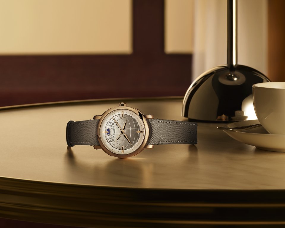1つ目のモデルは、ミニチュアペインティングで描いたワールドタイムリングと、歴史的なモノグラム・キャンバスの質感を讃え、時刻の読み取りやすさを高めるために、洗練されたグレイン仕上げのブルーセンターダイアルでアイコンを再解釈。馴染み深いワールドタイムのモチーフはそのままに、新開発の自社製LFT VO 12.01ムーブメントが複雑機構を昇華させ、アイコンの新たな時代を告げます。