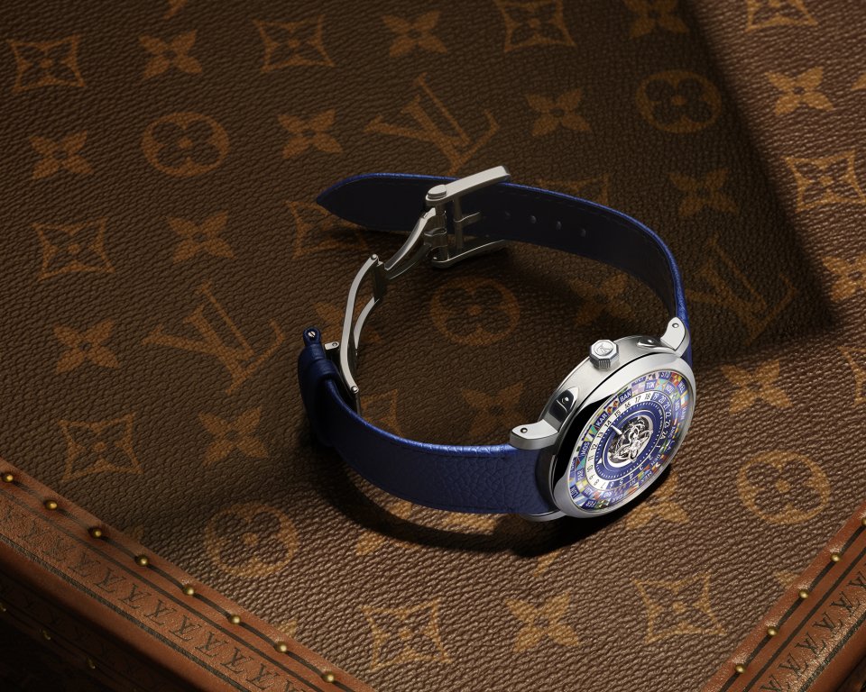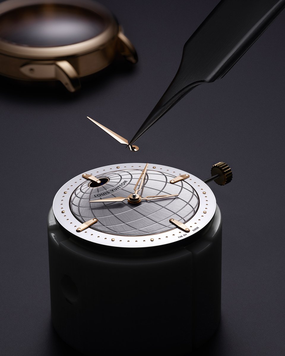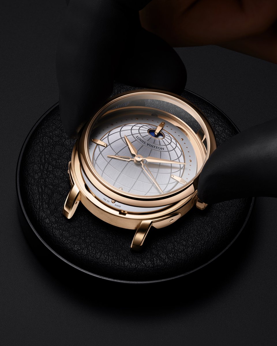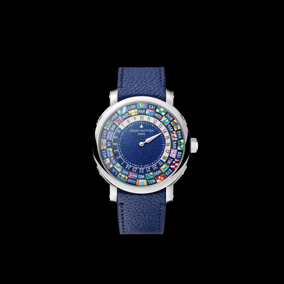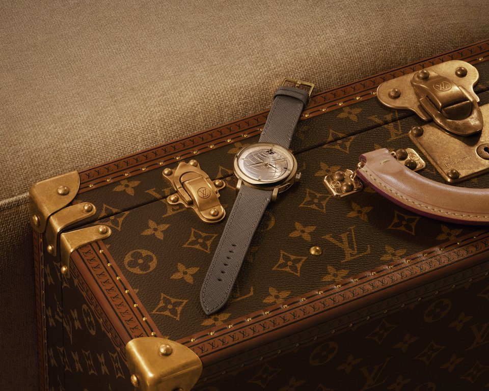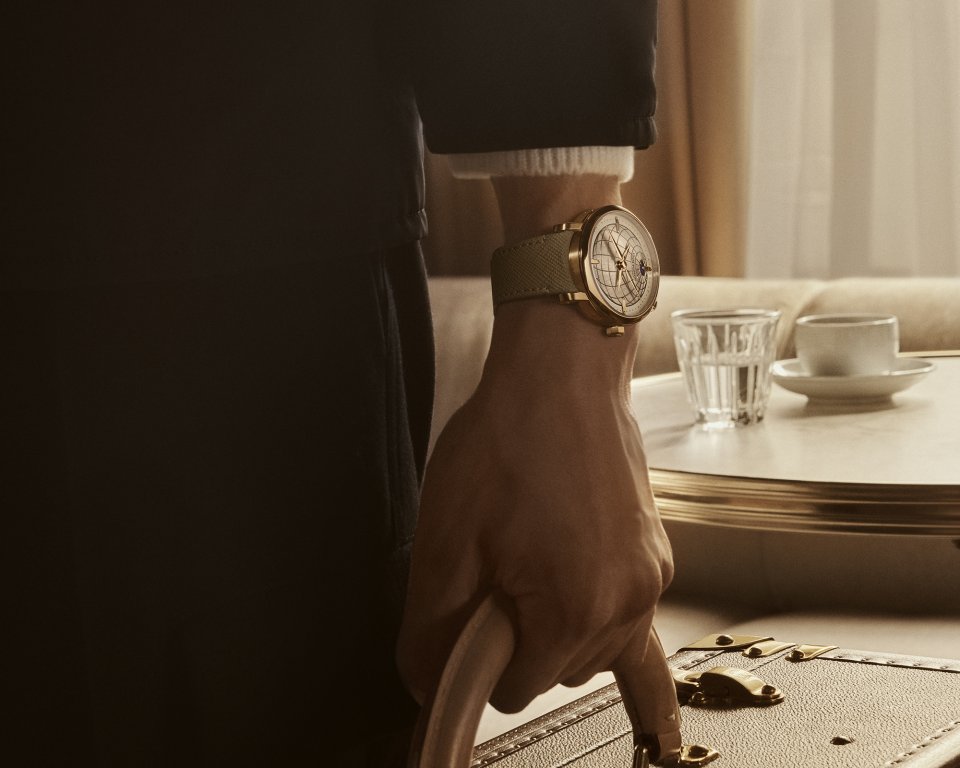オパールのような光沢感を湛えた繊細なフランジには、ルイ・ヴィトンのトランクに使われるビスを彷彿させるゴールドのスタッズのミニッツマーカーを配置。「ツインゾーン」が、メゾンが1世紀にわたり培ってきた、旅とサヴォアフェールのストーリーの中心に据えられていることを物語ります。