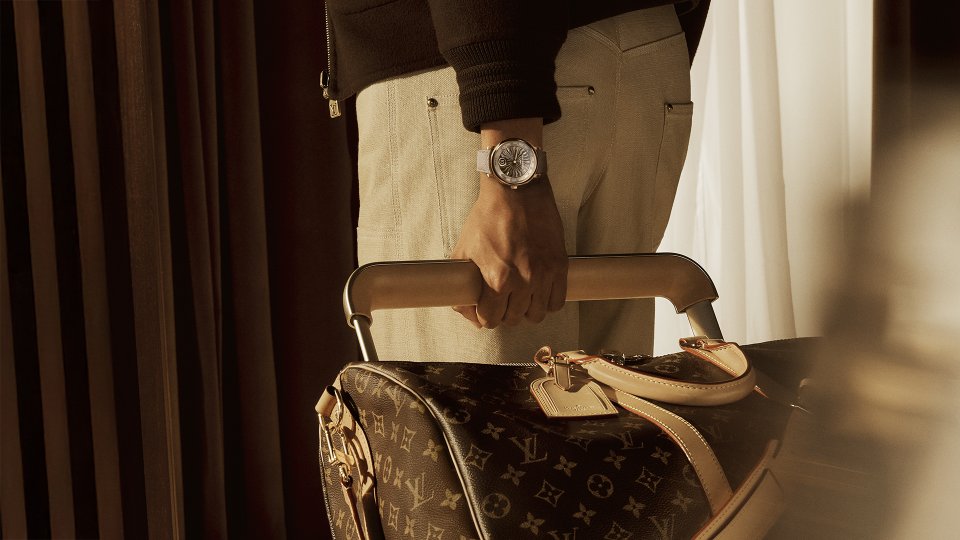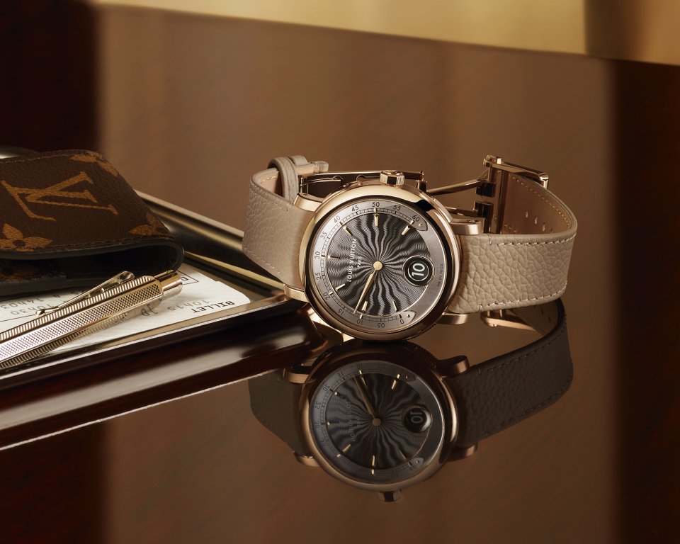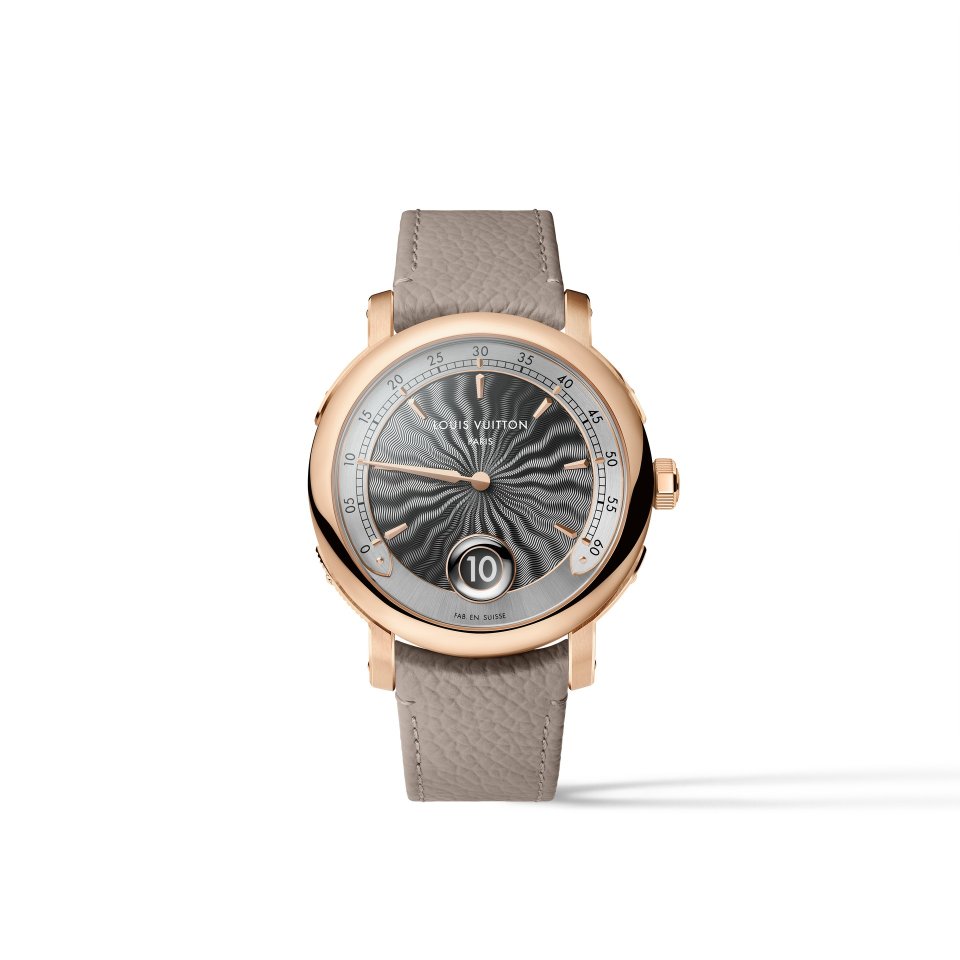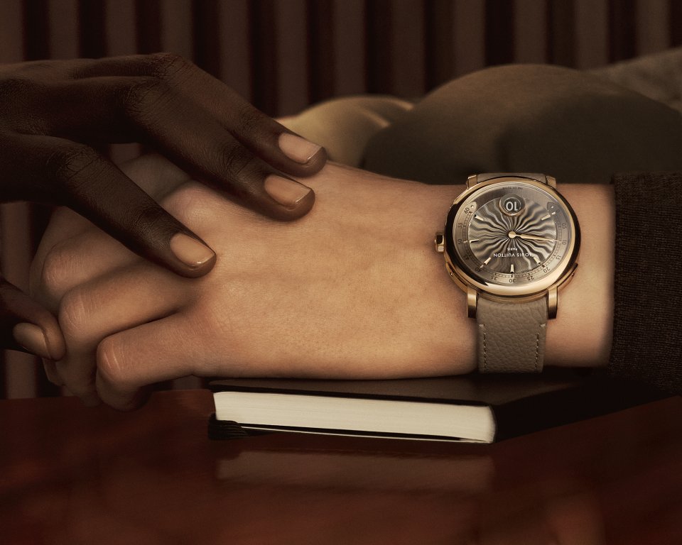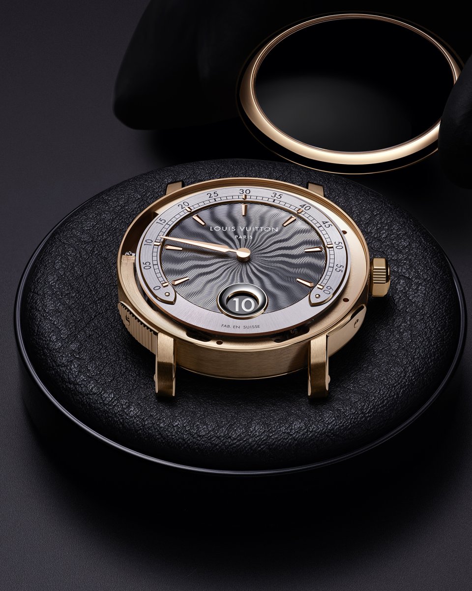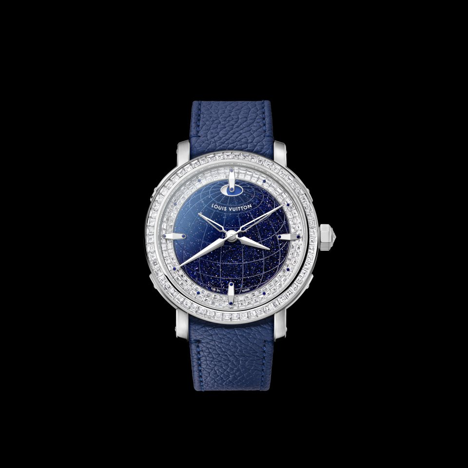 オパールのような光沢感を湛えた繊細なフランジには、ルイ・ヴィトンのトランクに使われるビスを彷彿させるゴールドのスタッズのミニッツマーカーを配置。「ツインゾーン」が、メゾンが1世紀にわたり培ってきた、旅とサヴォアフェールのストーリーの中心に据えられていることを物語ります。