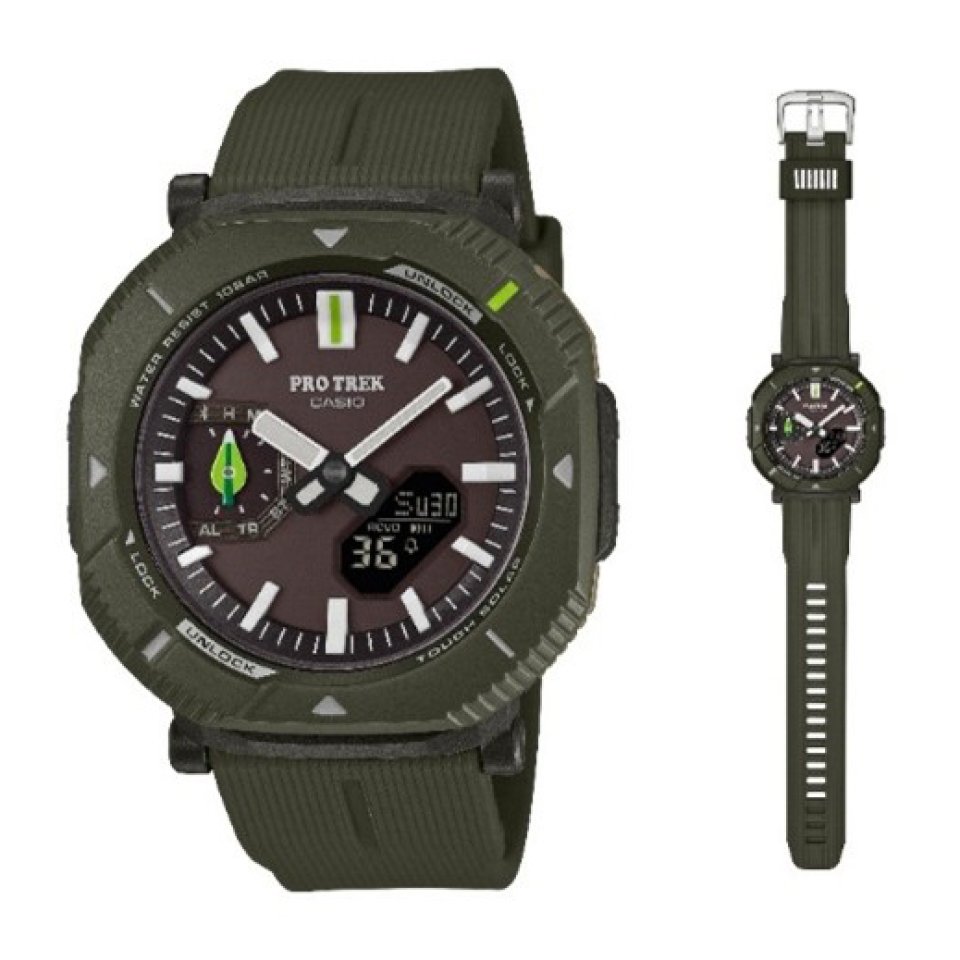 今回ご案内する『PRJ-B001NJ』は、葉っぱを手にした「アース&ピクルス ビーンドール」をモチーフに、里山の豊かな自然を守りたいという想いと安全なアウトドアライフへの想いをデザインに落とし込んだモデルです。深みのあるダークグリーンをベースに、裏蓋、12時位置のインデックス、ボタン、小針には、明るくフレッシュなグリーンカラーを配色。デザイン性を保ちながら腕元に自然と馴染む仕上がりです。