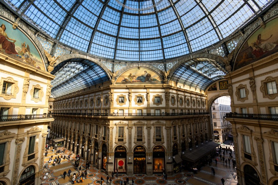 歴史あるアーケードは、高くそびえるガラスドームや装飾的なアイアンフレーム、そして自然光が降り注ぐ大理石のフロアで知られ、ミラノを象徴する名所のひとつです。