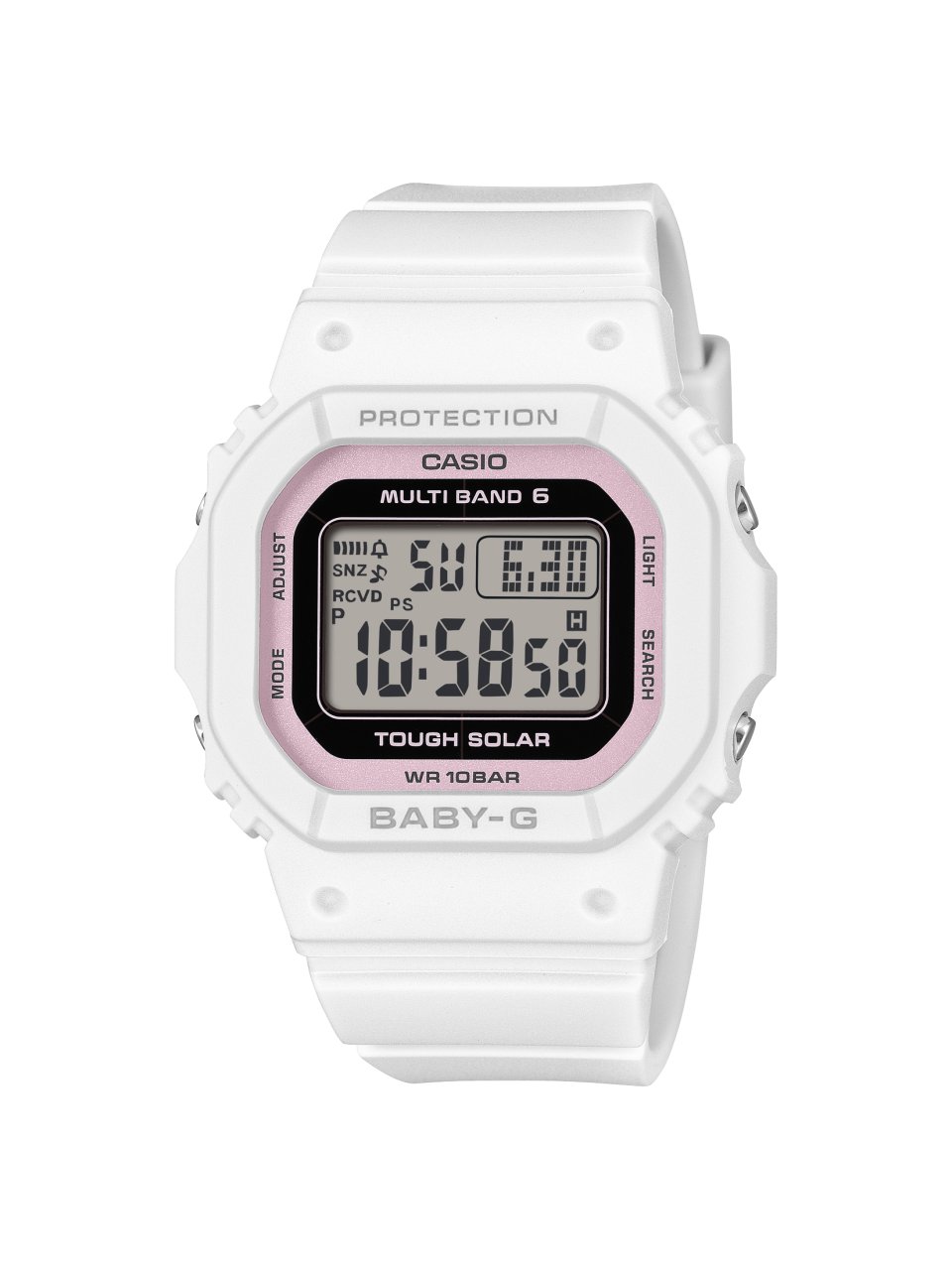 『BGD-5650SP』は、人気のスクエアデザインを採用したコンパクトなモデルです。耐衝撃構造と10気圧防水性能に加え、タフソーラーおよび世界6局対応の標準電波受信機能であるマルチバンド6を搭載し、正確な時刻表示と高い実用性を実現しています。軽量で装着感に優れ、幅広いファッションシーンに調和するデザインです。