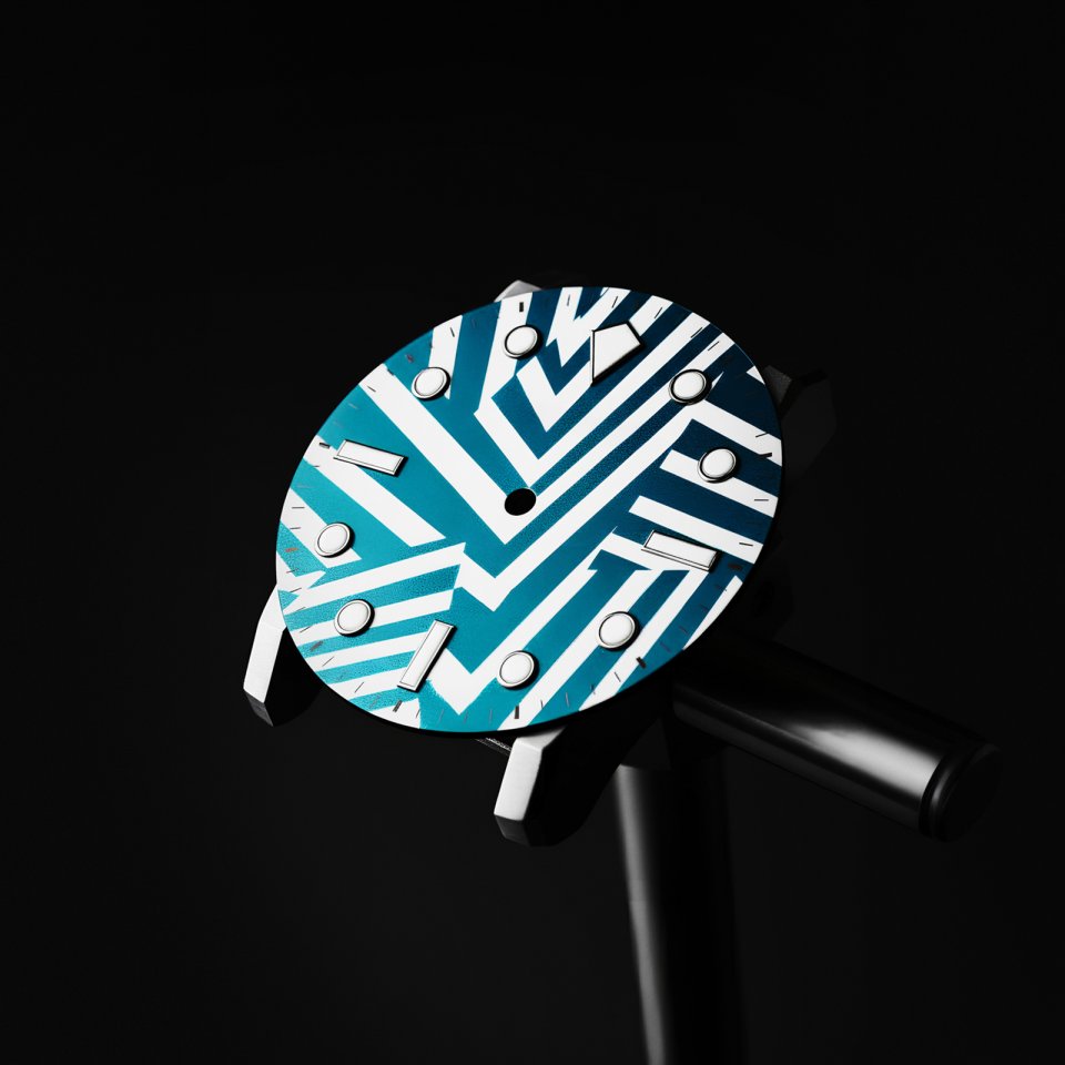 シンプルなバトン針や、バーとドットを組み合わせたインデックスは、ラズル・ダズル迷彩の幾何学模様と高い親和性を持ち、見る者を幻惑。秒針やロゴ、ベゼルの目盛りに用いた鮮烈なレッドカラーは、強烈なインパクトを与えた上で迷彩効果を果たそうという、このパターンらしい配色です。6時位置には、デザイナーであるクリス・アレクサンダーの異名「THE DIAL ARTST」が刻印されています。