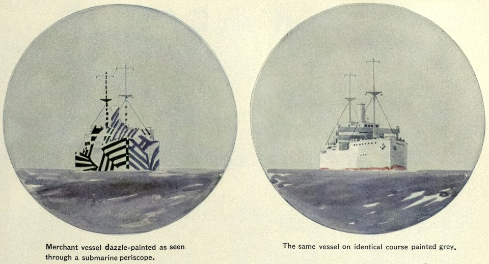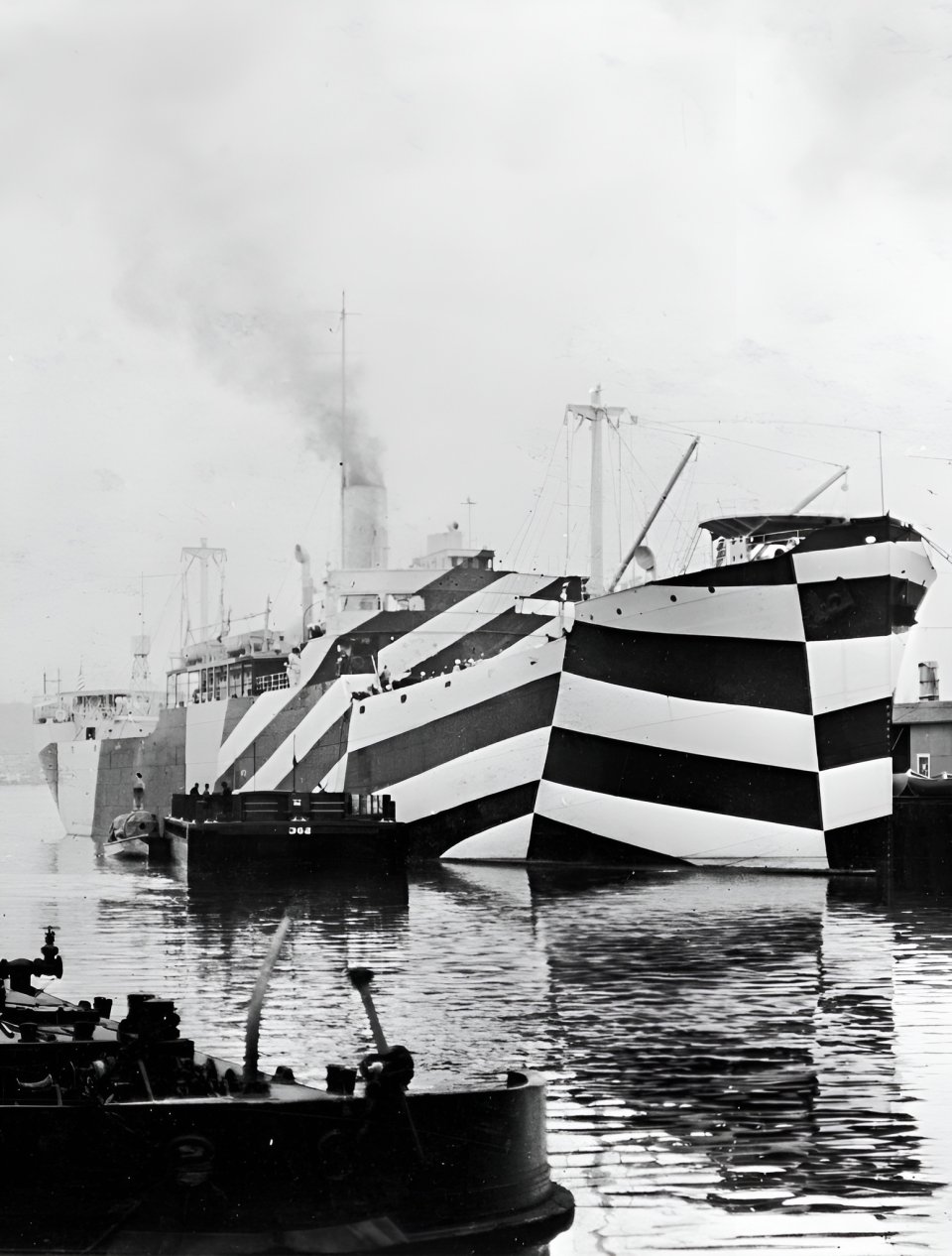 ラズル・ダズルは、主に第一次世界大戦時に船舶用迷彩として使われていました。ハイコントラストかつ幾何学的なストライプやブロックが施すことで、その対象の形状や進行方向、距離感を錯覚させ、敵の攻撃から逃れることを目的としていました。