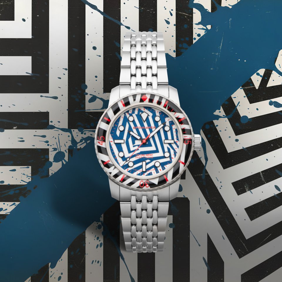 視線を落とすたび、“時間の輪郭”を見失うかもしれません。スピニカーのフルース 40 オートマティック ラズル・ダズル リミテッドエディションはかつてないほど前衛的でトリッキーなパターンにより、見る者を幻惑し、魅了します。英国人アーティストのクリス・アレクサンダーがデザインを手掛けた、500個の限定モデルです。
