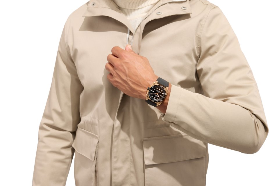 このタイムピースは、海で過ごす一日にも港で迎えるエレガントな夜にもふさわしく、あらゆるシーンに自然に溶け込みます。スポーティでありながら洗練され、テクニカルでありながら貴重性を備えたスタイルを体現し、着用する人の経験やライフスタイルをさりげなく引き立てます。 銅色を帯びたブロンズケース、深みのあるブラックダイアル、そして針に施されたゴールドのアクセントが、際立ったコントラストを生み出しながら、瞬時に調和の取れた視覚的バランスを構築しています。このカラーコンビネーションによって、時計のアイデンティティはいっそう明確になり、エレガンスを保ちながらも、手元で印象的な存在感を放ちます。